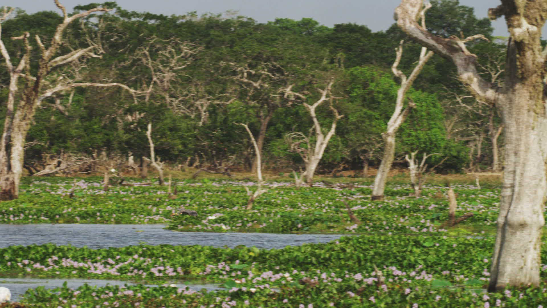 WS PAN Purple heron (Ardea purpurea) flying / Yala National Park; Southern Province; Sri Lanka
