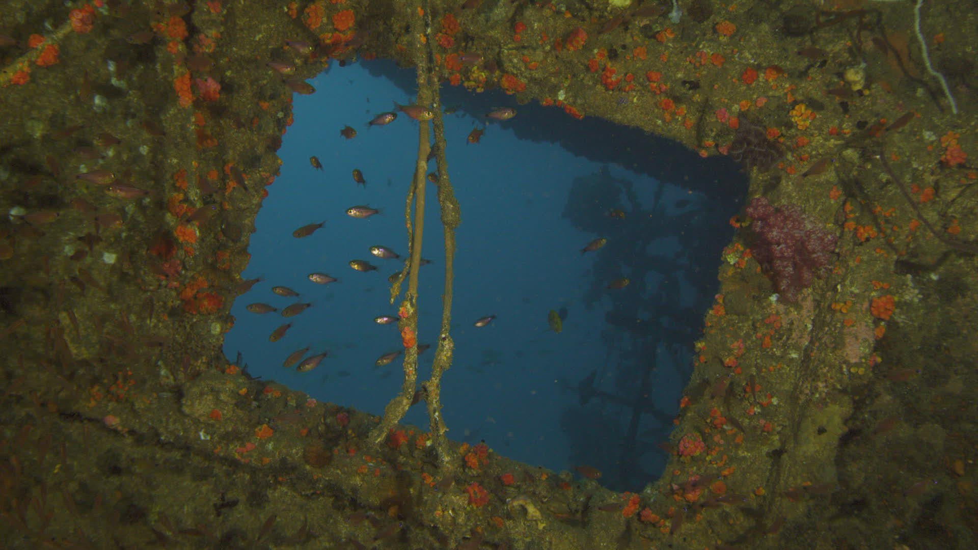 WS POV Fish swimming inside shipwreck in Indian Ocean / Sri Lanka