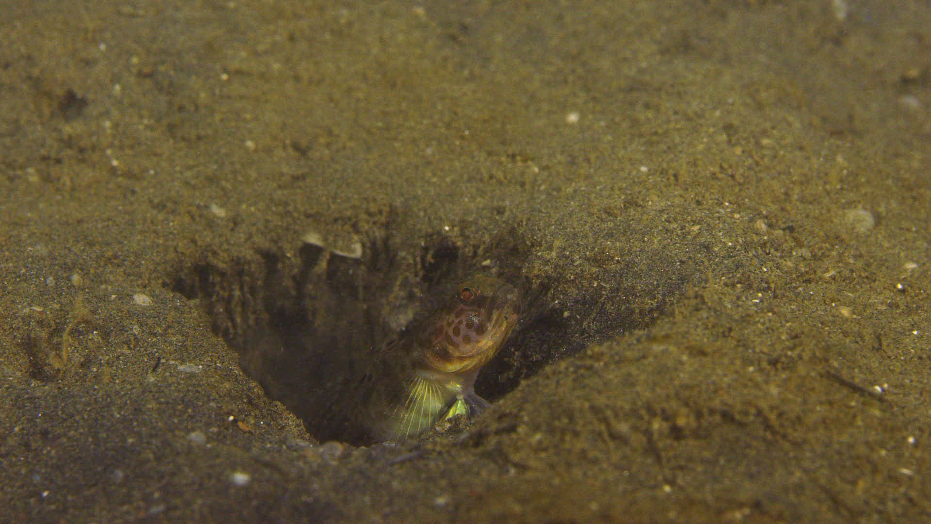 MS POV Watchman goby (Cryptocentrus) hiding in hole in sand on bottom of Indian Ocean / Sri Lanka