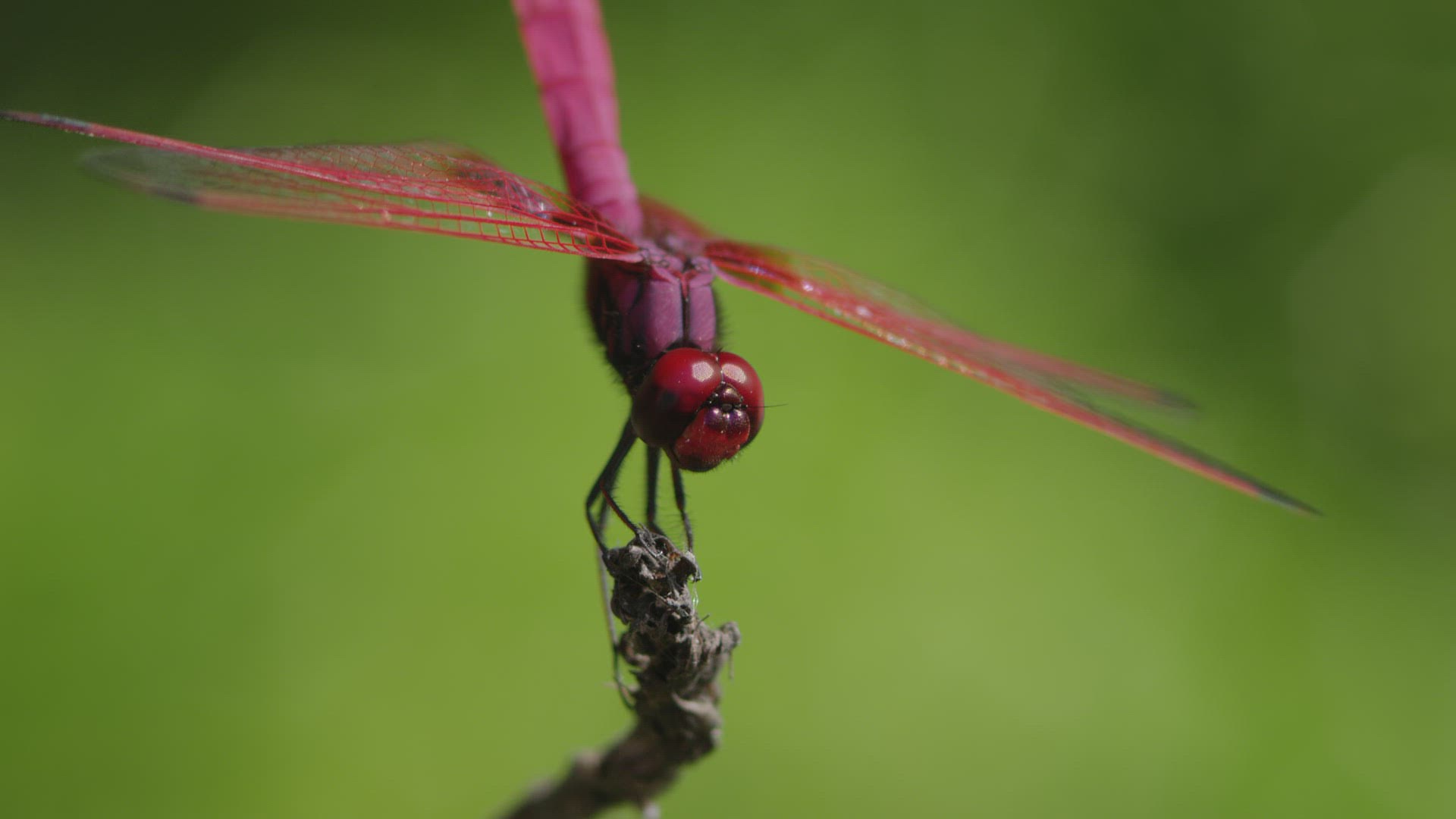 CU Crimson marsh glider (Trithemis aurora) perching on twig in rainforest / Sri Lanka