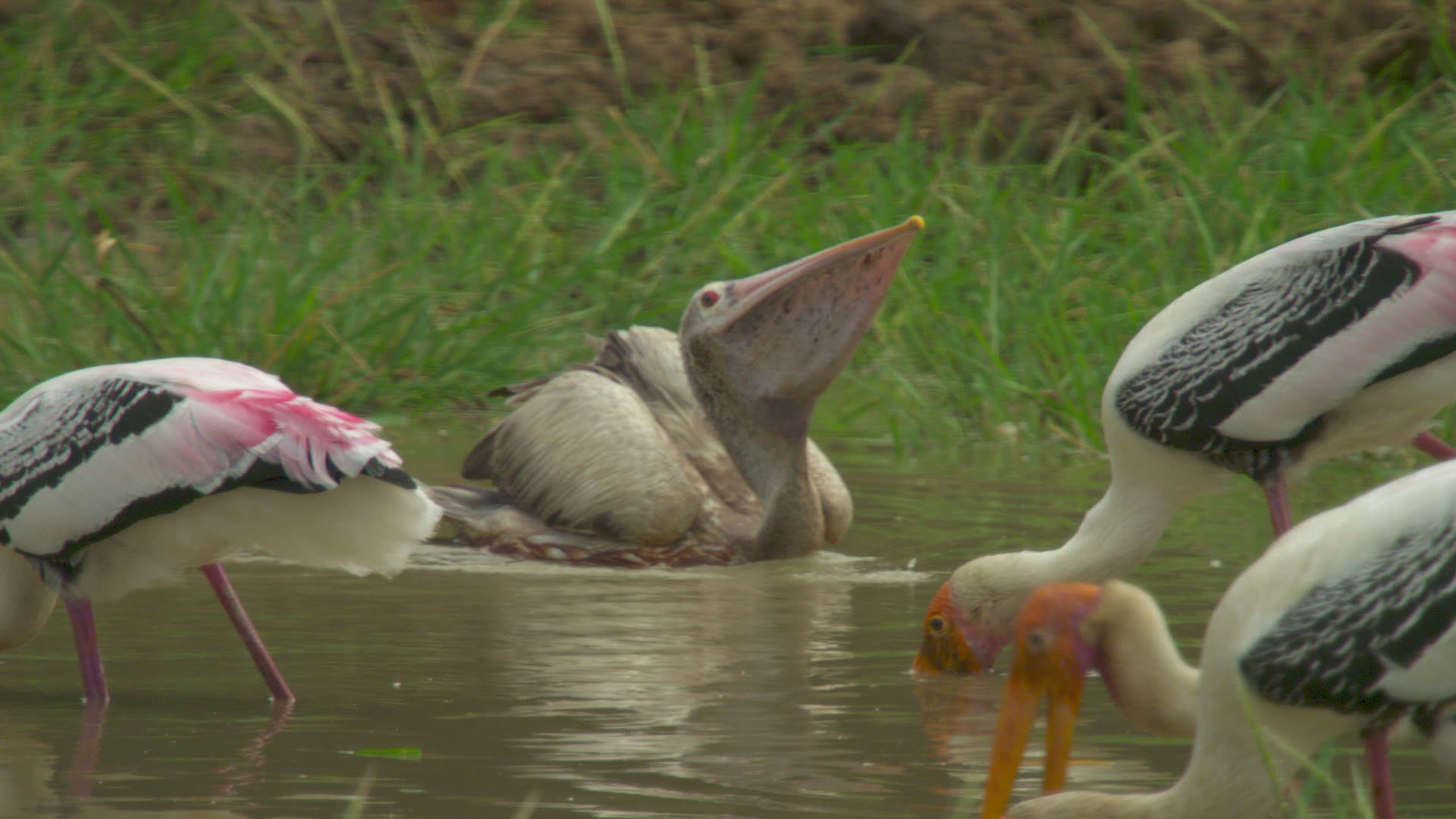 MS PAN Spot-billed Pelican (Pelecanus philippensis) and Painted storks (Mycteria leucocephala) foraging in river / Yala National Park; Southern Province; Sri Lanka