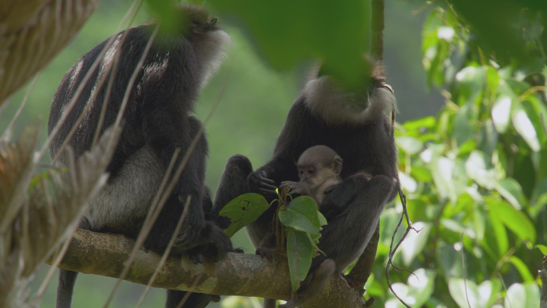 MS SELECTIVE FOCUS Purple-faced langur (Trachypithecus vetulus) holding baby / Sri Lanka