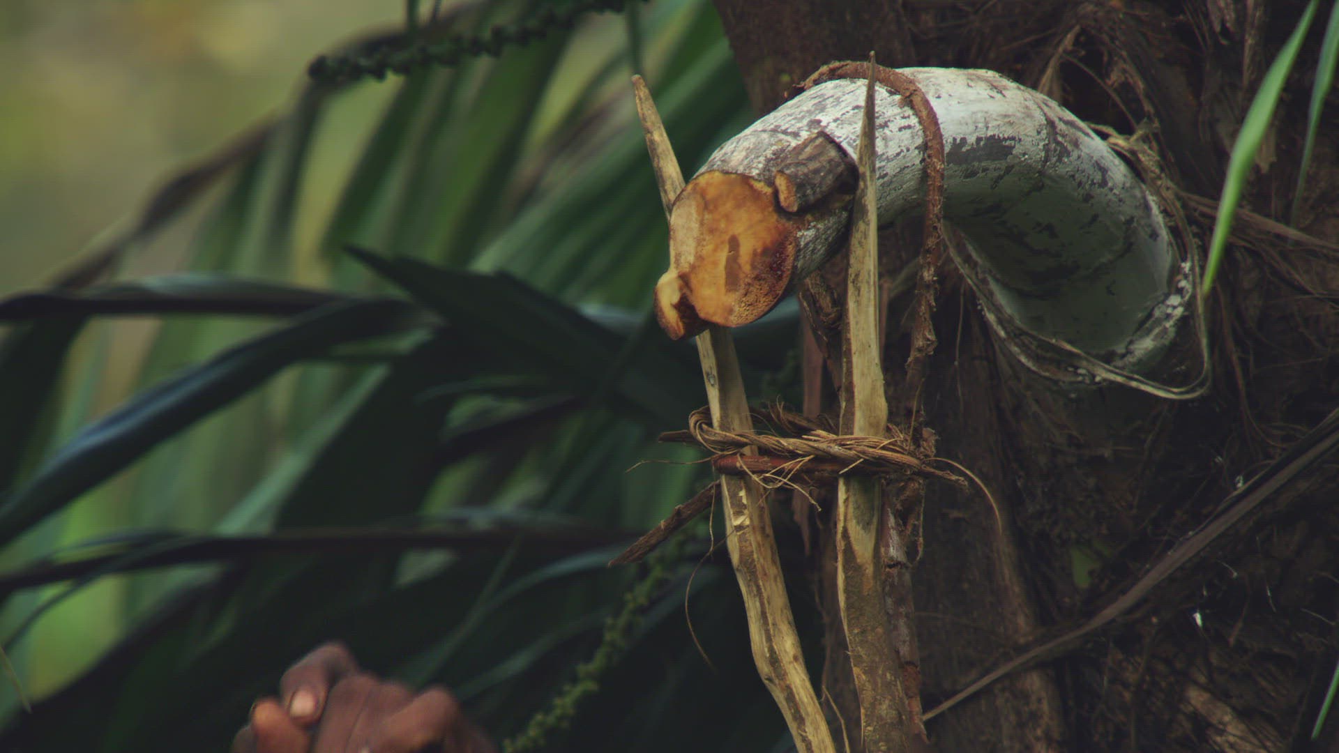 MS Man cutting thin layers from flowers of kitul palm in rainforest / Sri Lanka