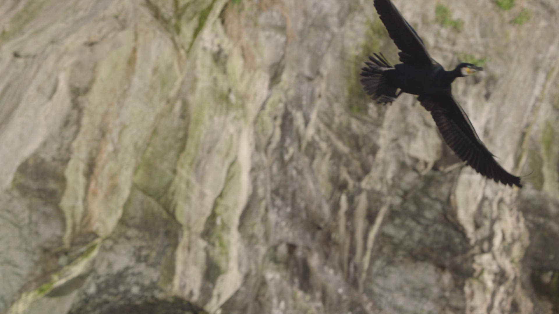 MS TS POV Great cormorant (Phalacrocorax carbo) flying above rocks / Cornwall; United Kingdom