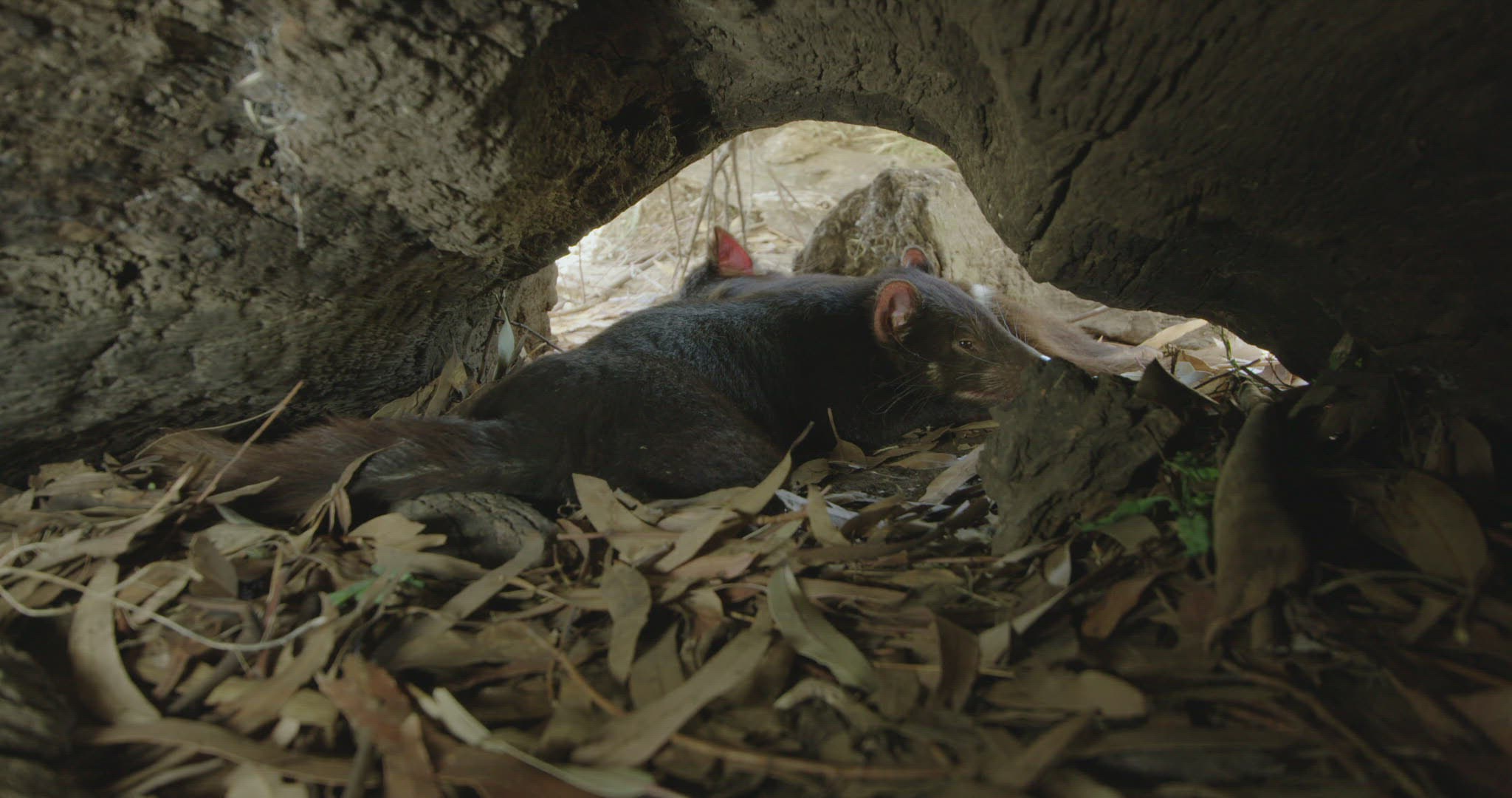 WS Tasmanian Devils (Sarcophilus harrisii) sleeping in burrow / Tasmania
