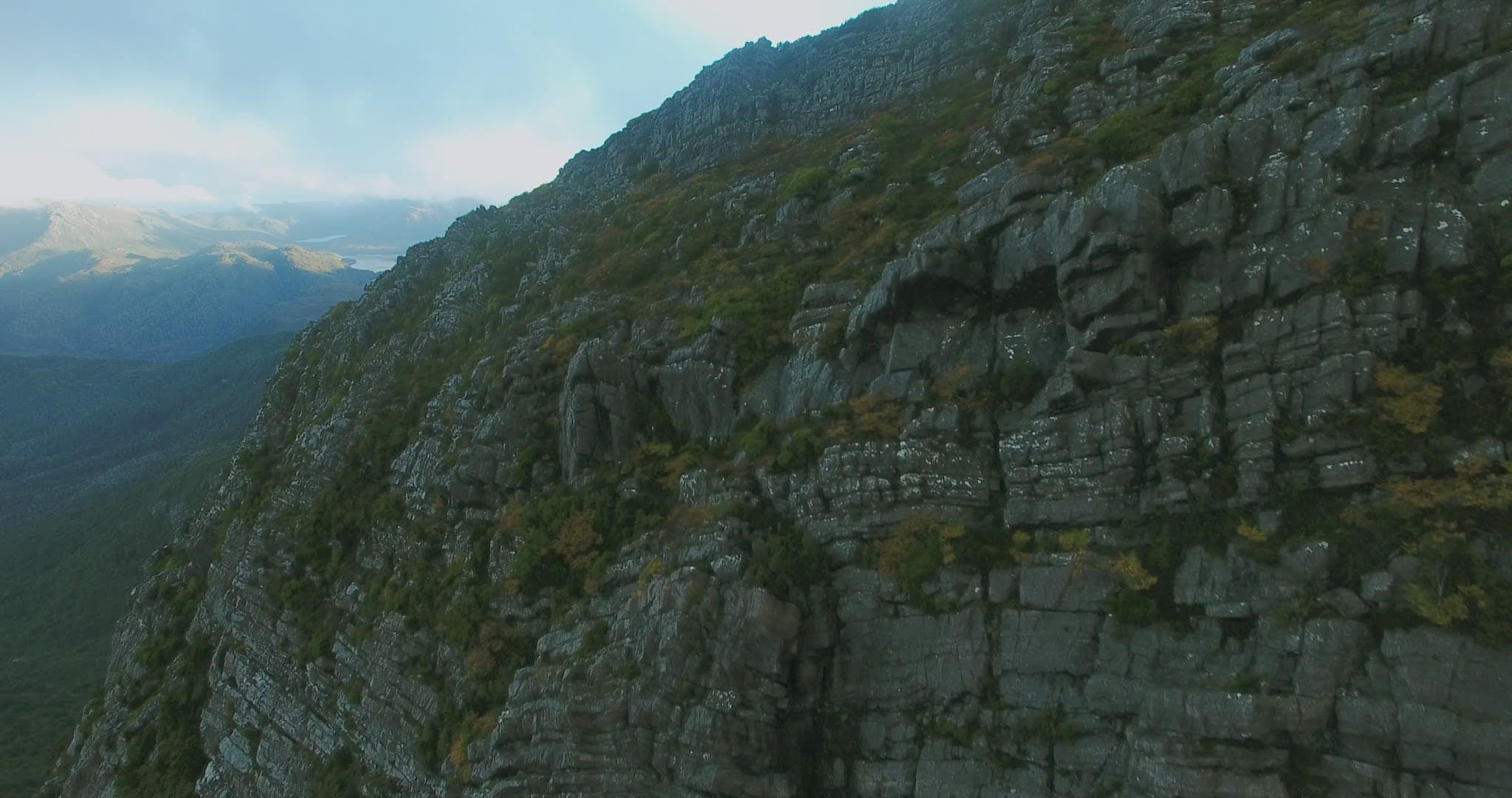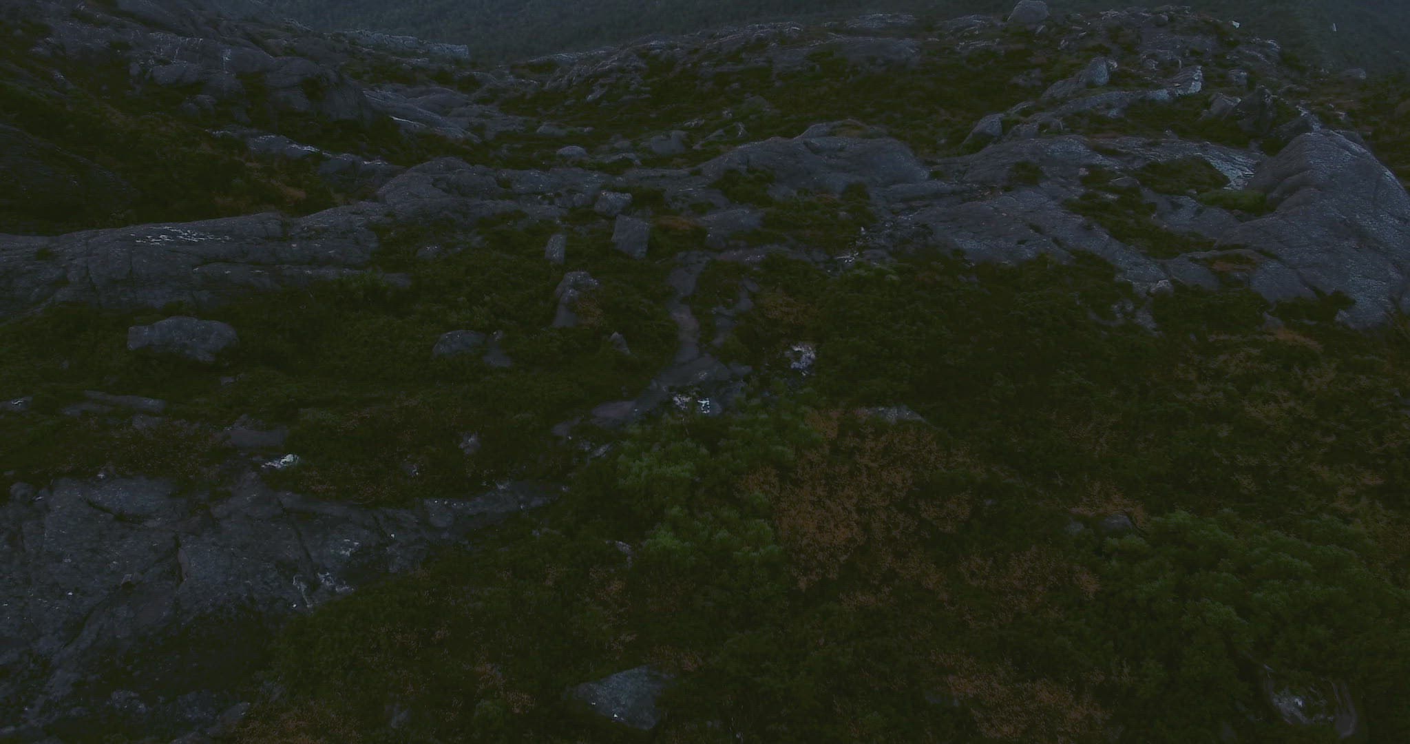 WS POV Rocks covered with lichen; bushes and trees / Tasmania