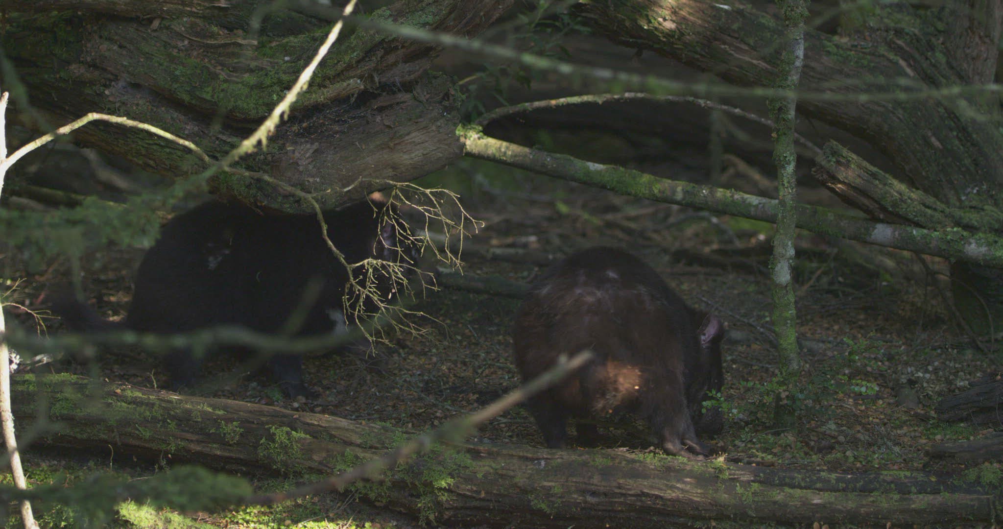 WS Tasmanian Devils (Sarcophilus harrisii) foraging between fallen trees / Tasmania