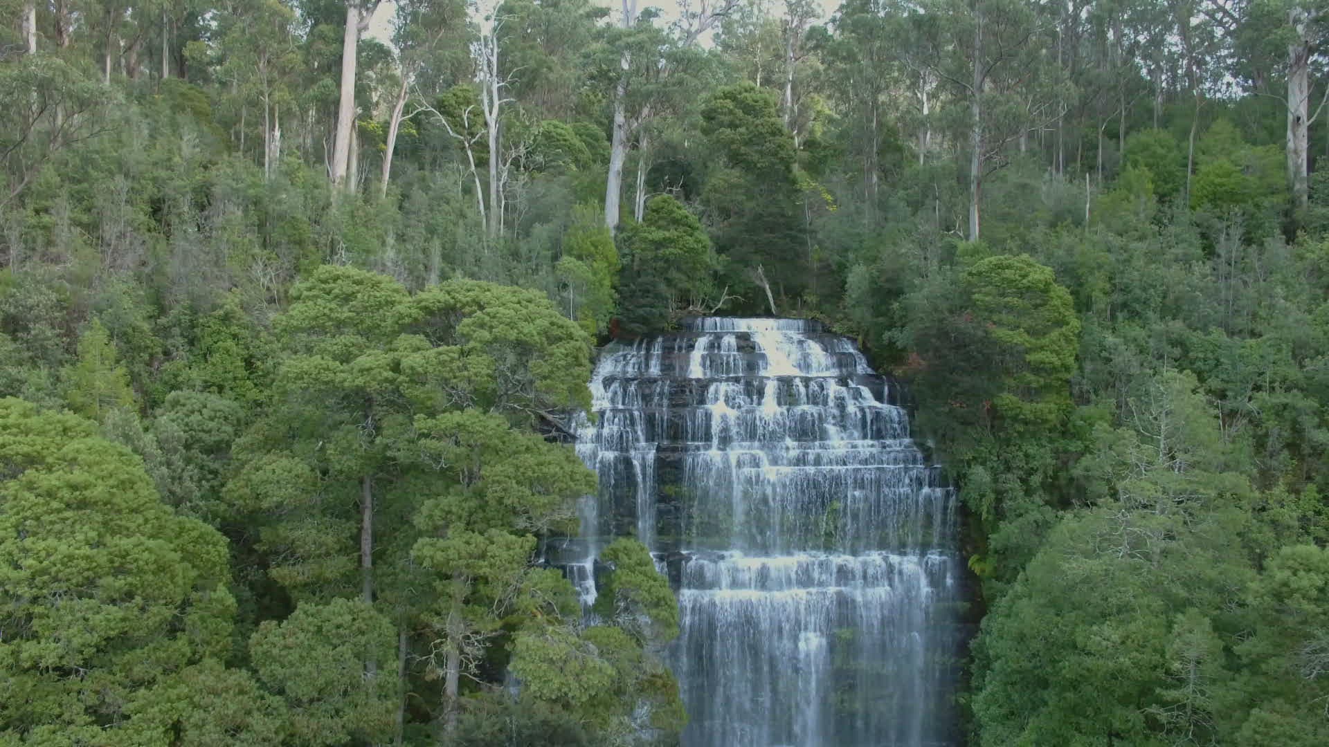 WS AERIAL Scenic view of cascade waterfall in forest / Tasmania