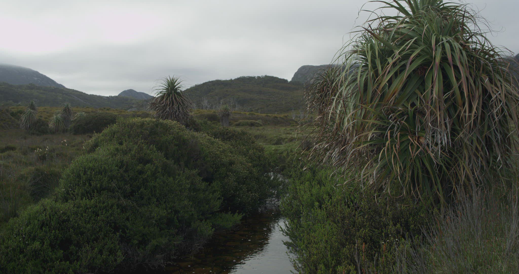 WS Landscape with Pandani (Richea pandanifolia) trees and river / Tasmania