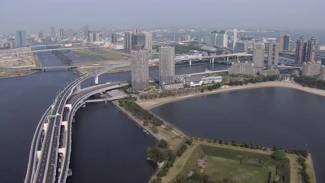 Aerial elevated vehicle traffic Tokyo Bay Shuto Expressway nautical vessels