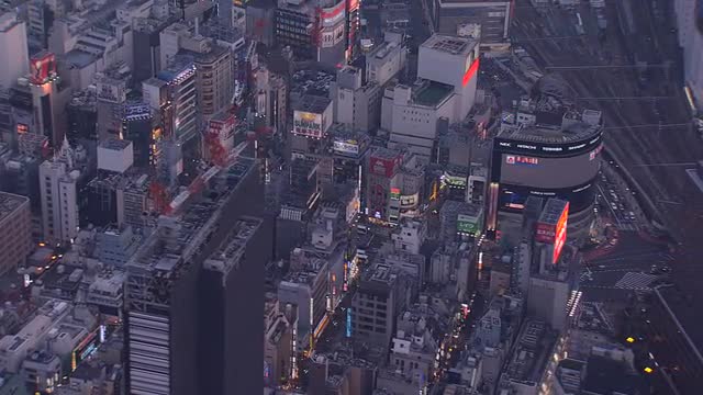 Aerial illuminated Shinjuku buildings downtown Rail Track Tokyo Japan