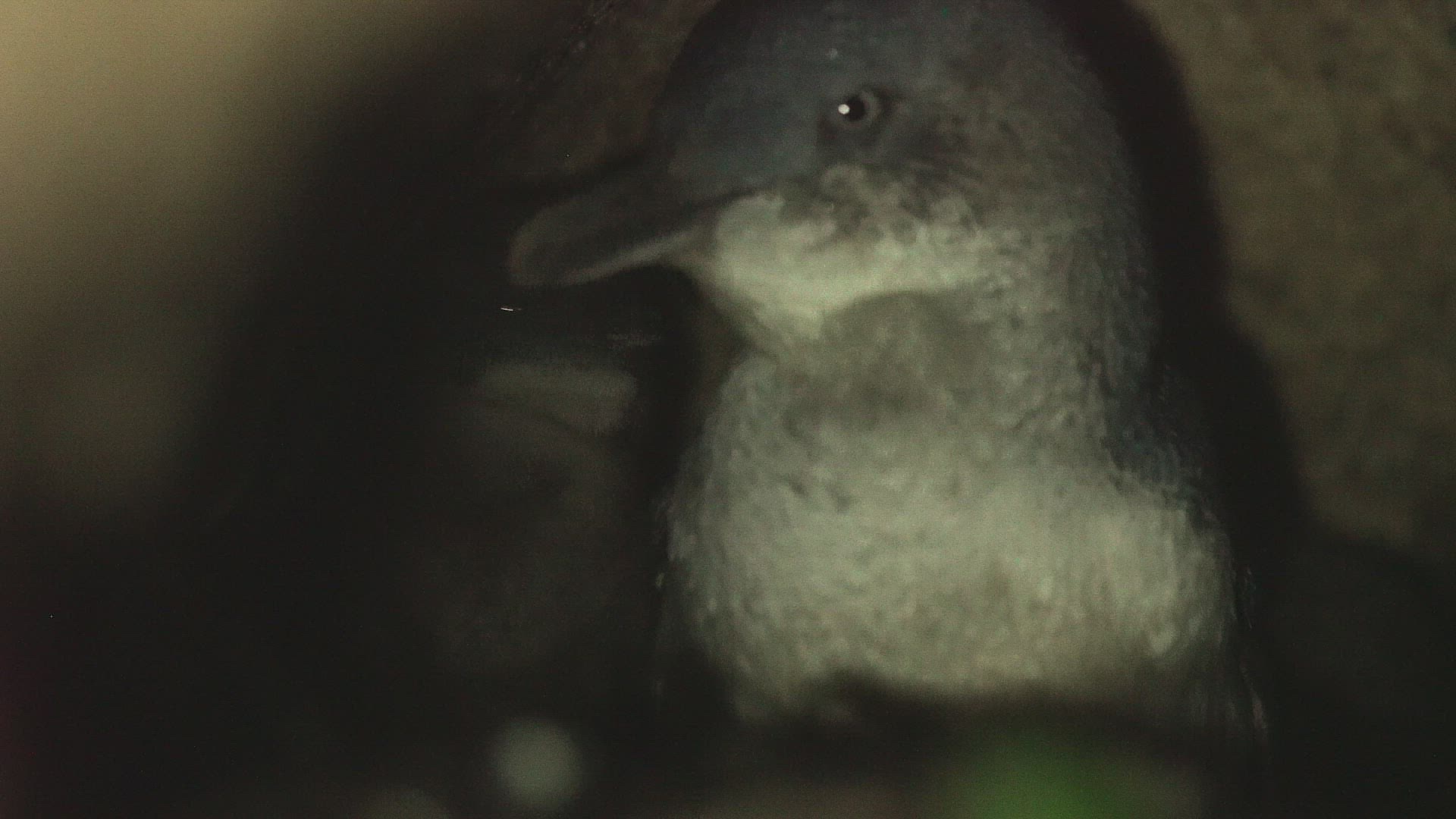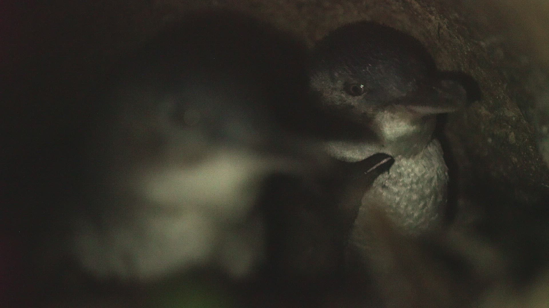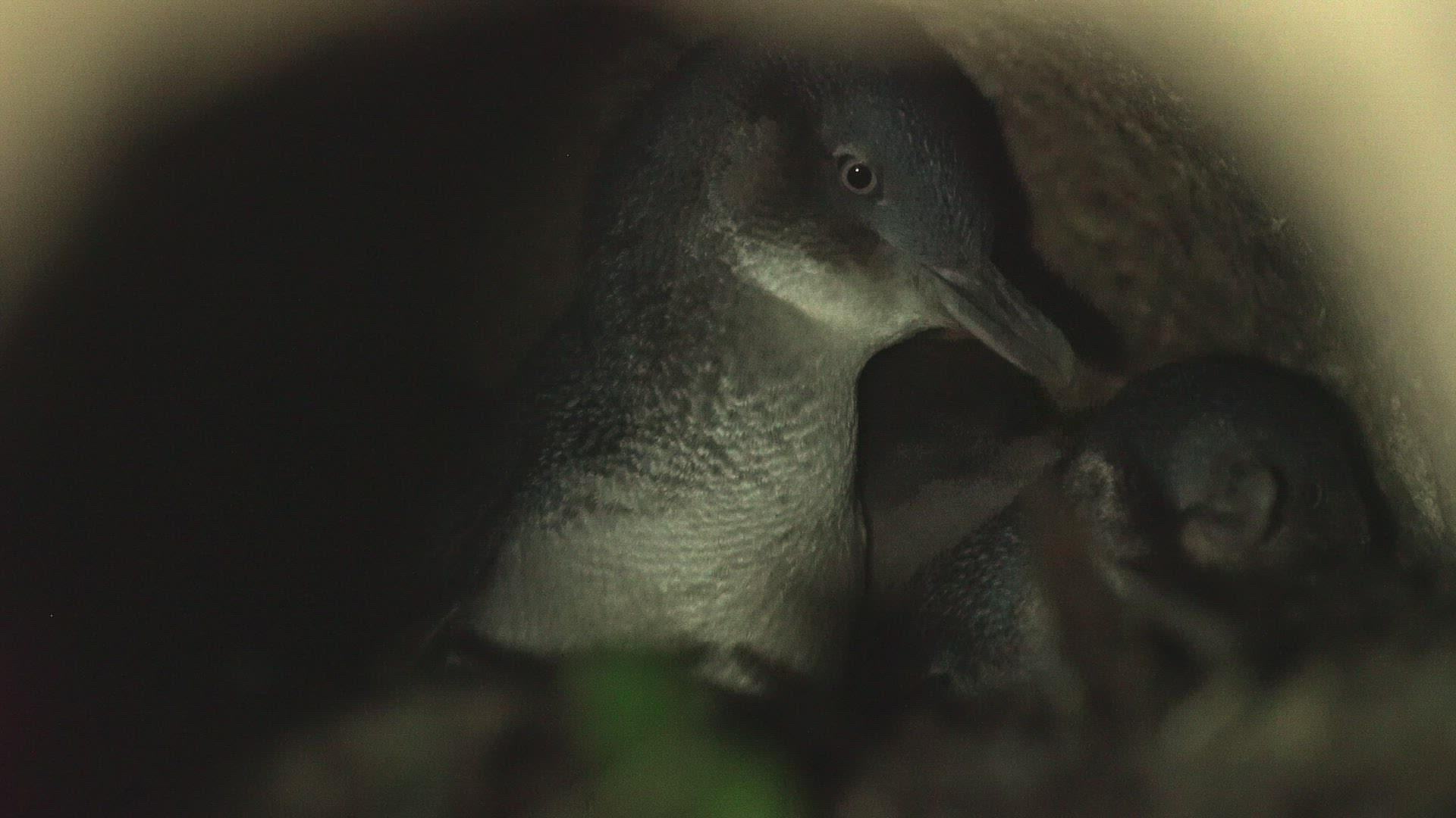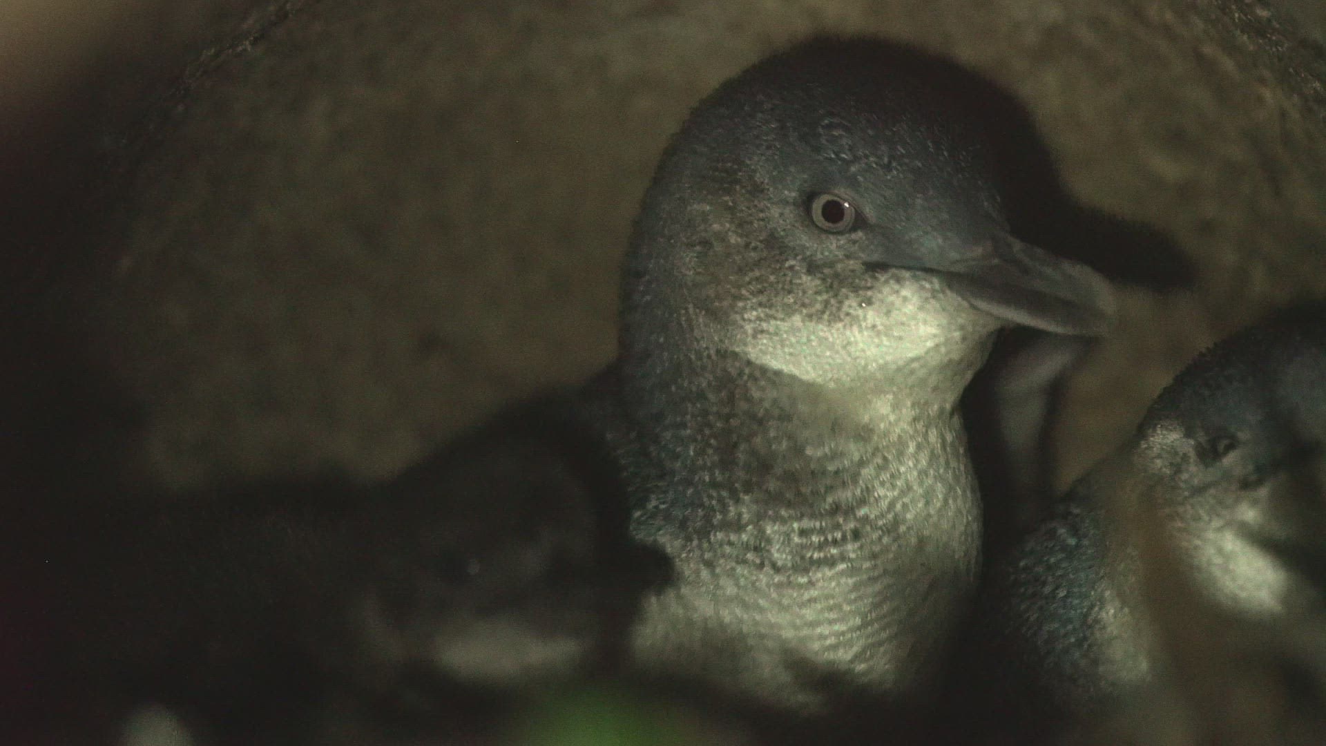 MS SELECTIVE FOCUS Three Little Penguins (Eudyptula minor) in nest / Tasmania