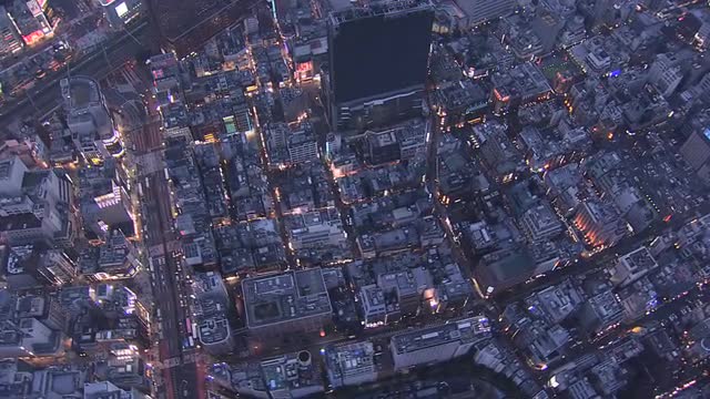 > Aerial illuminated Shinjuku buildings lights Rail Track Tokyo Japan