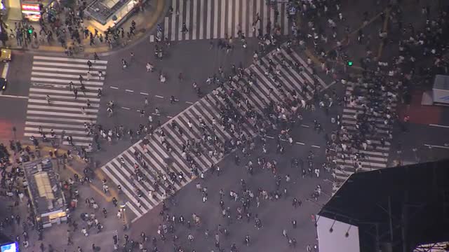 Aerial illuminated Shibuya scramble crossing traffic intersection Tokyo