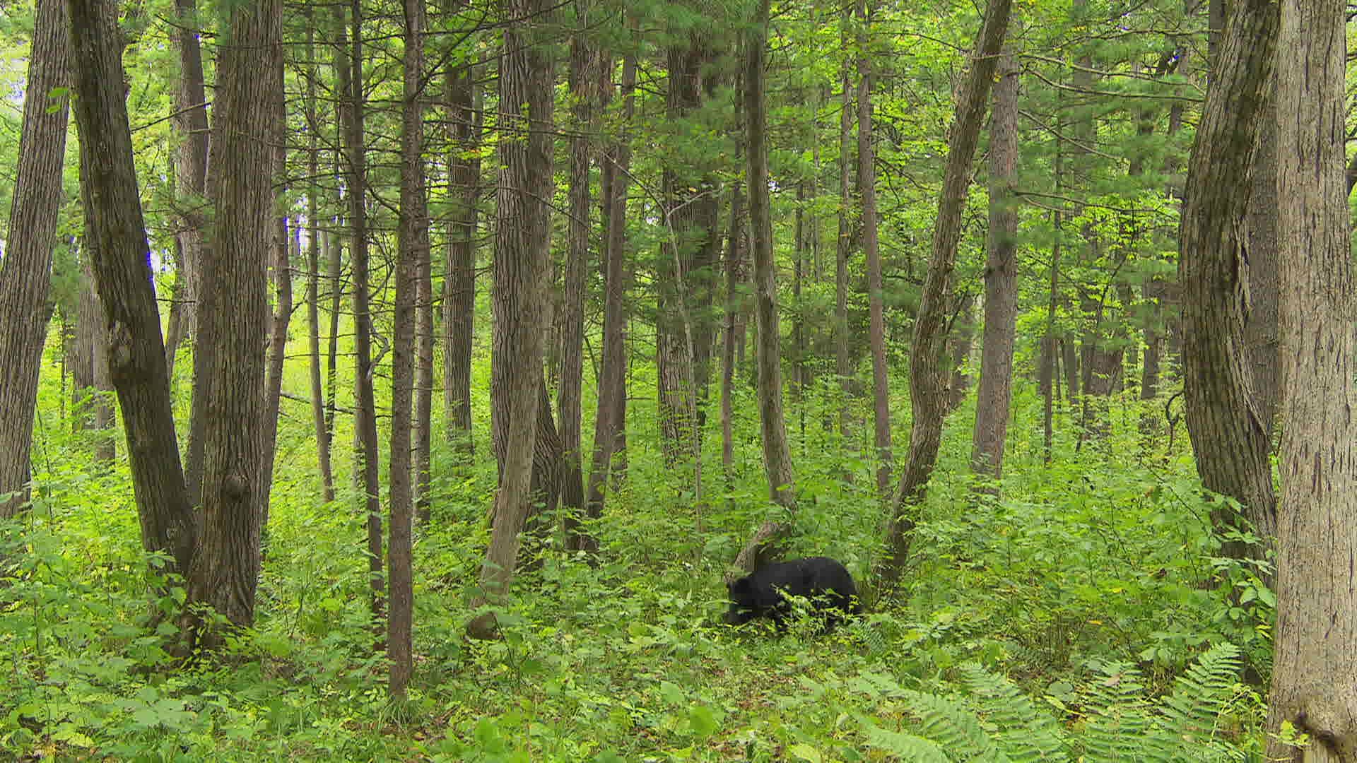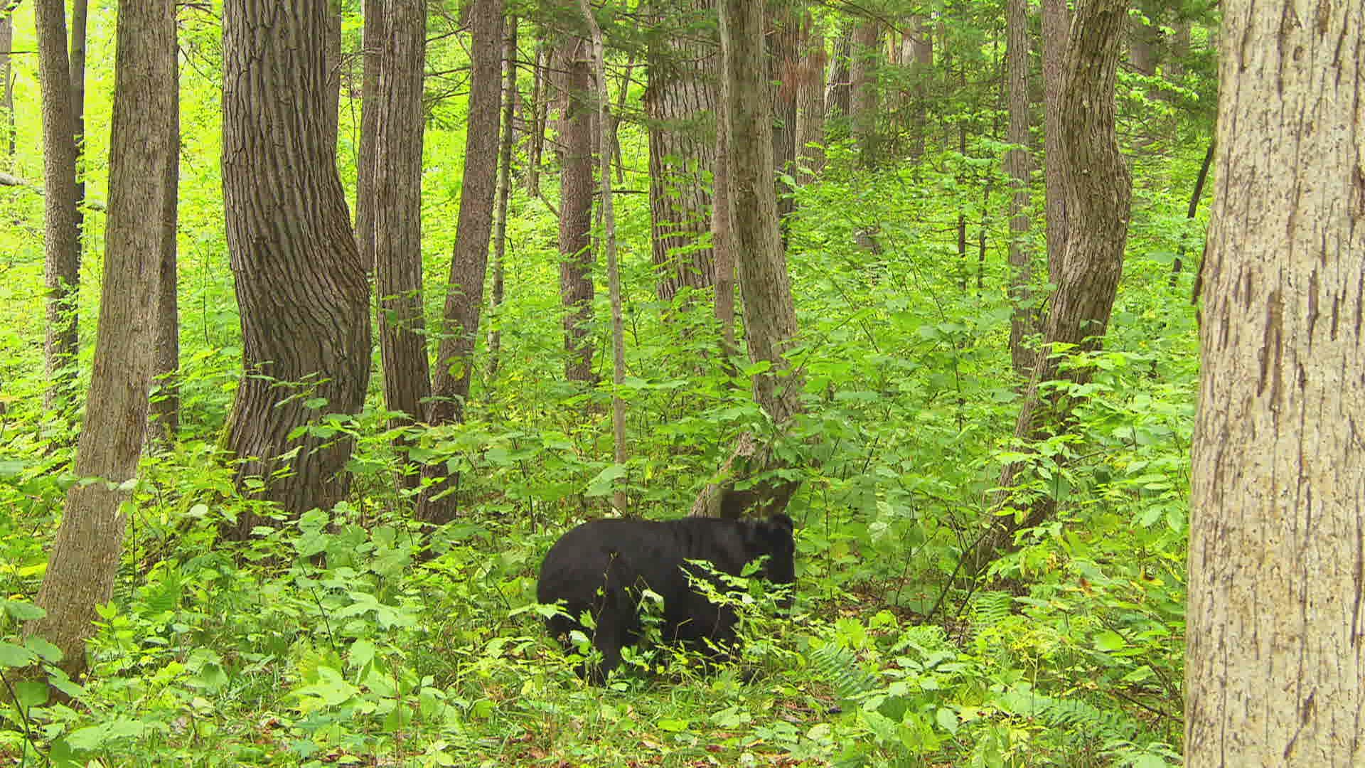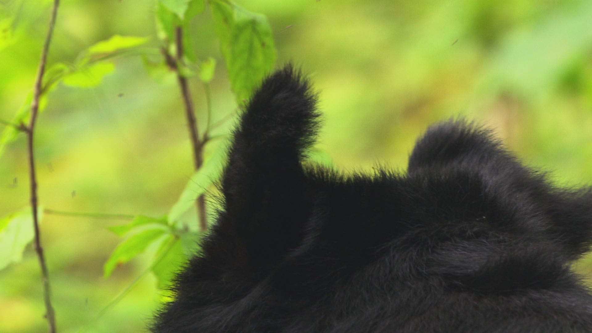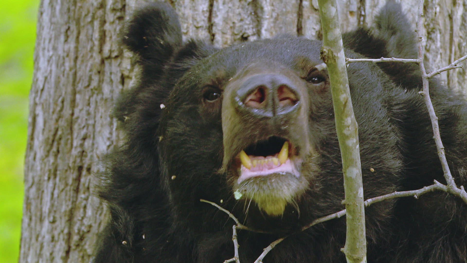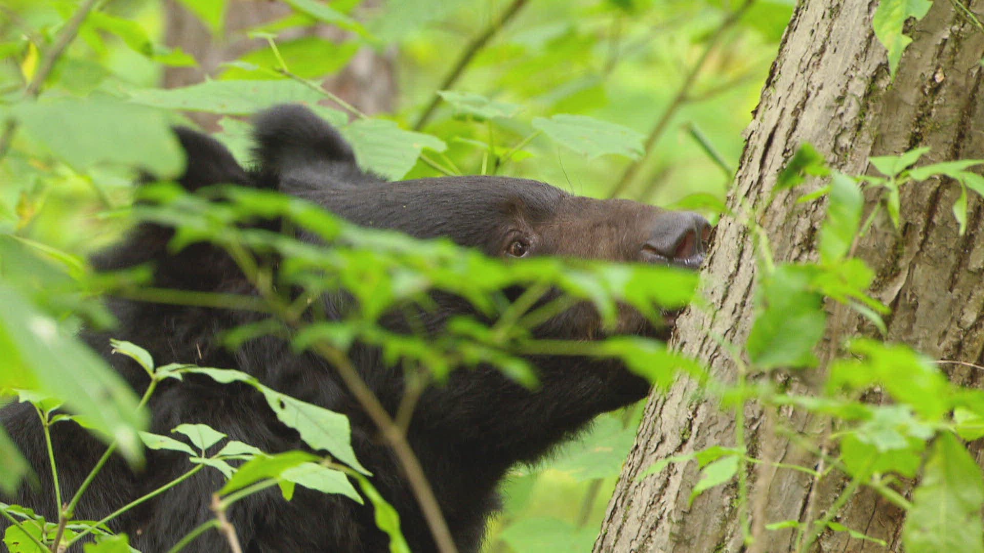 MS Asian black bear (Ursus thibetanus) leaning against tree trunk / Siberia; Russia