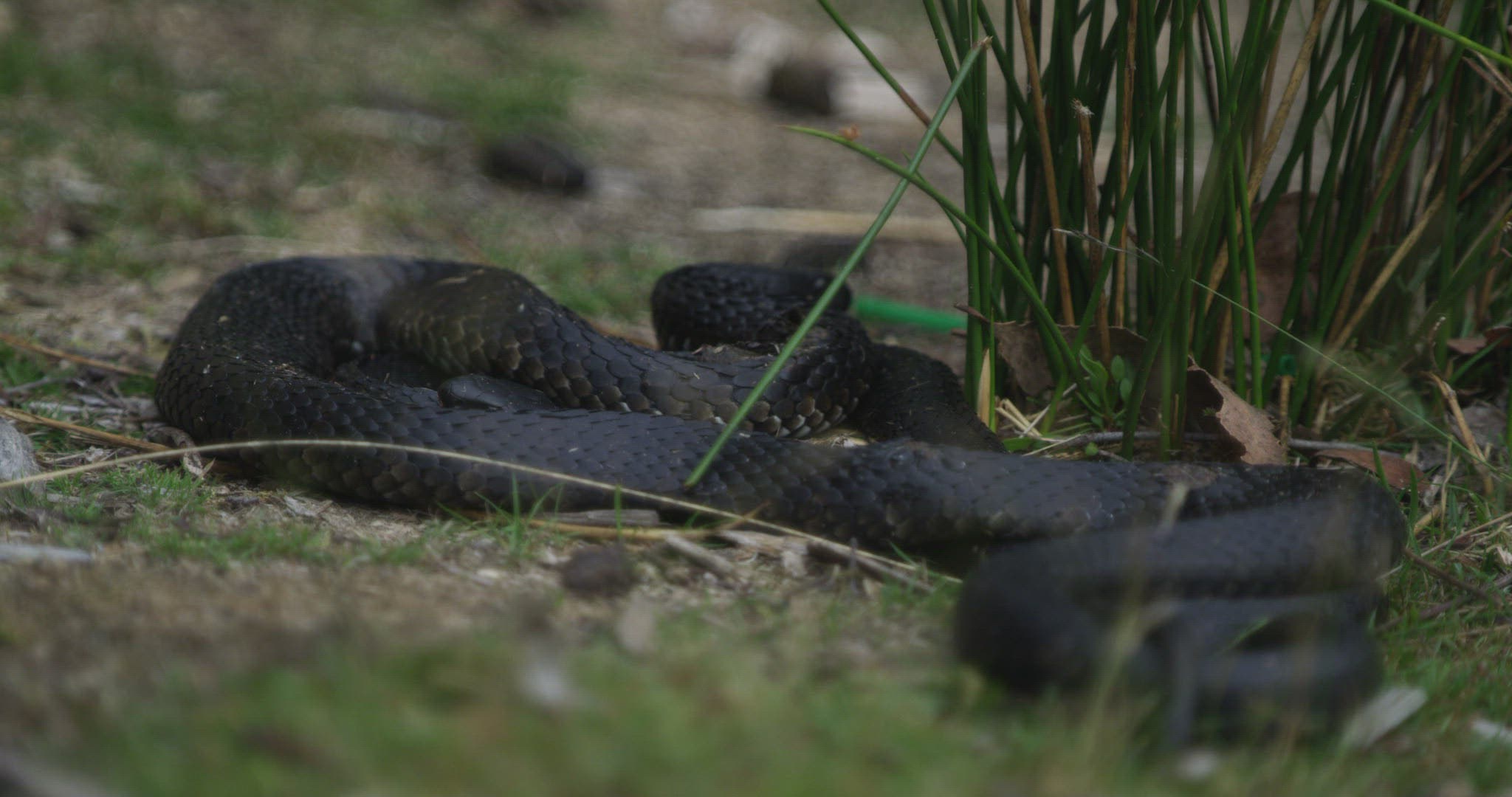 WS SELECTIVE FOCUS Black Tiger Snake (Notechis scutatus) lying and looking around / Tasmania
