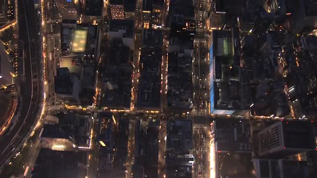 > Aerial illuminated overhead entertainment district night Tokyo Metropolis Japan