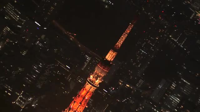 > Aerial illuminated close up Metropolis night Tokyo Tower Odaiba Japan