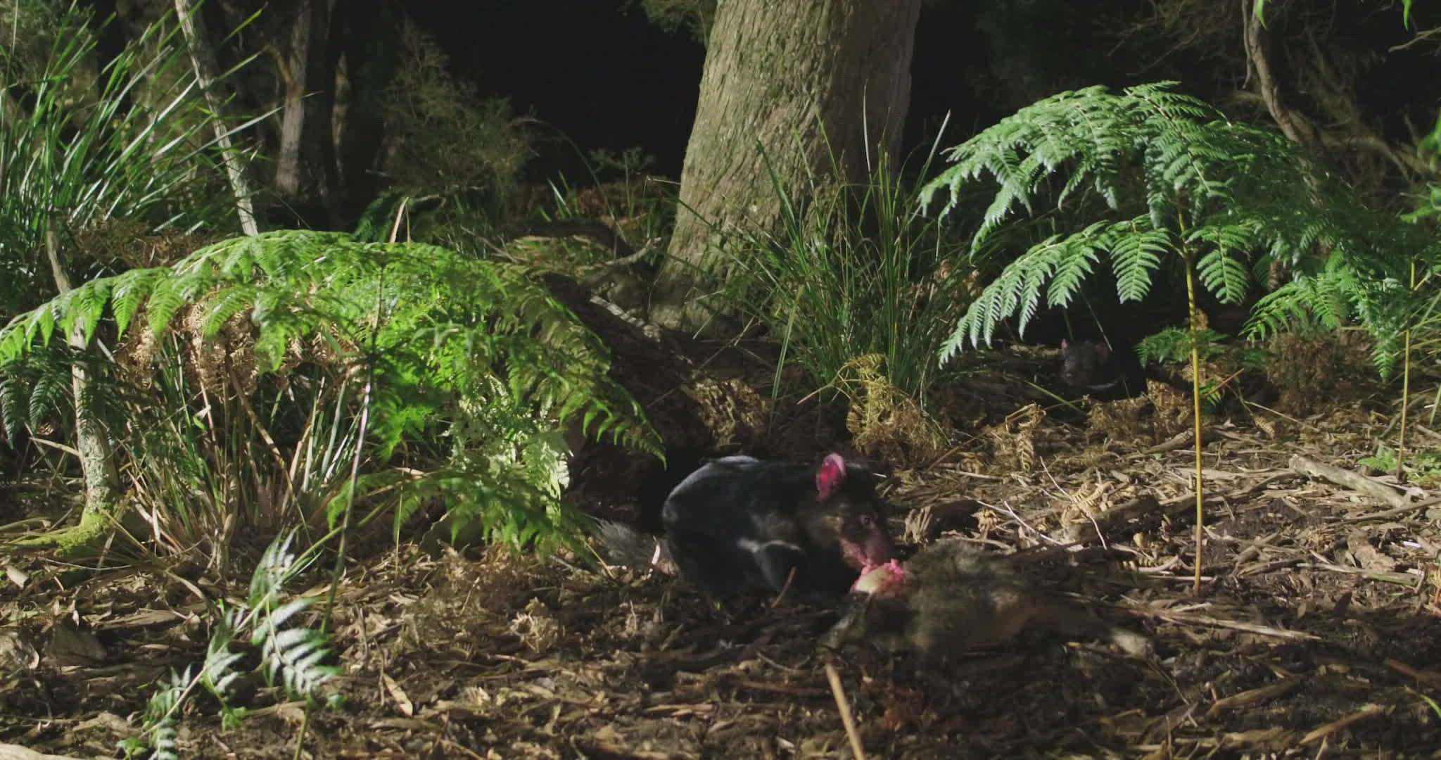 WS Tasmanian Devil (Sarcophilus harrisii) foraging; other tasmanian devil in background / Tasmania