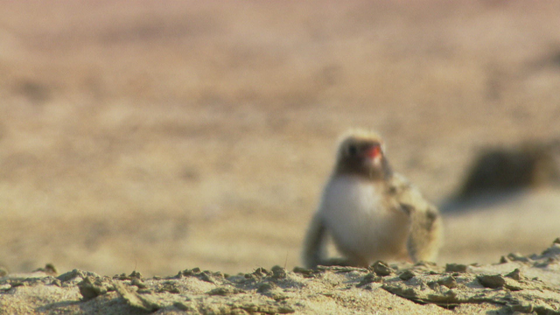MS SELECTIVE FOCUS PAN Tern (Sterna hirundo) attacking nestling on sandy riverbank / Russia