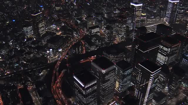 > Aerial Metropolis night Tokyo illuminated skyscraper Hakozaki interchange Japan