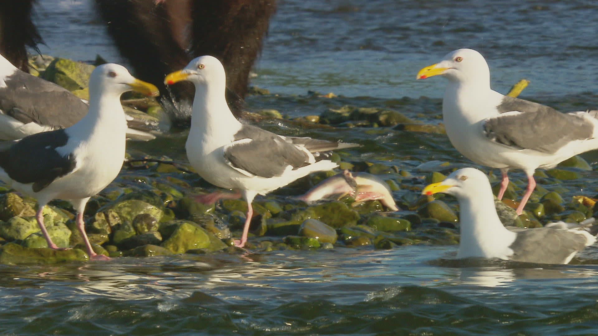 CU TU TD PAN Brown bear (Ursus arctos) picking up dead fish and walking among gulls (Larus schistisagus) in Amur river / Russia