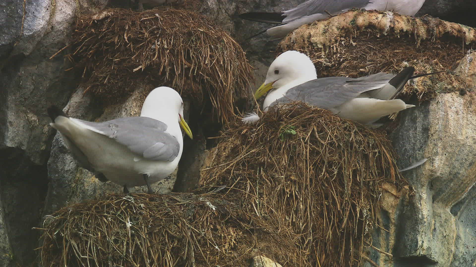 MS Gulls (Larus schistisagus) in nest on cliff / Russia