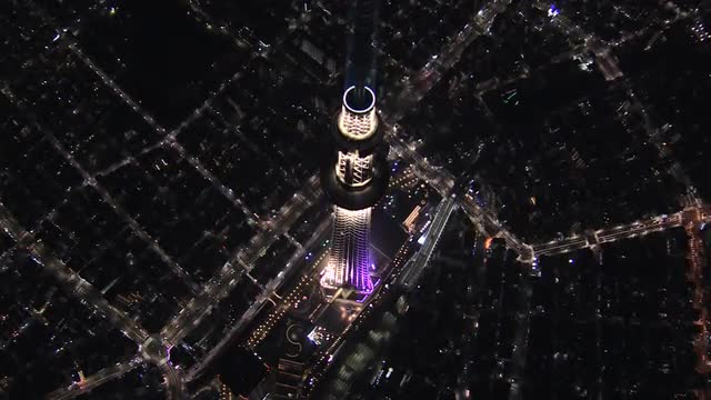 > Aerial overhead illuminated Skytree broadcasting Tower Sumida district Tokyo