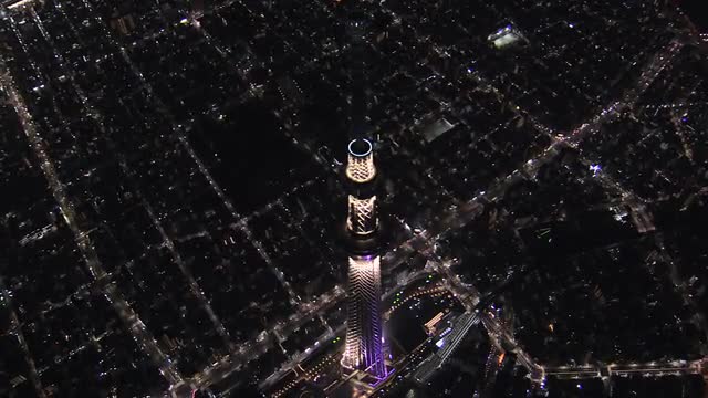 > Aerial illuminated Skytree broadcasting Tower Sumida district Tokyo
