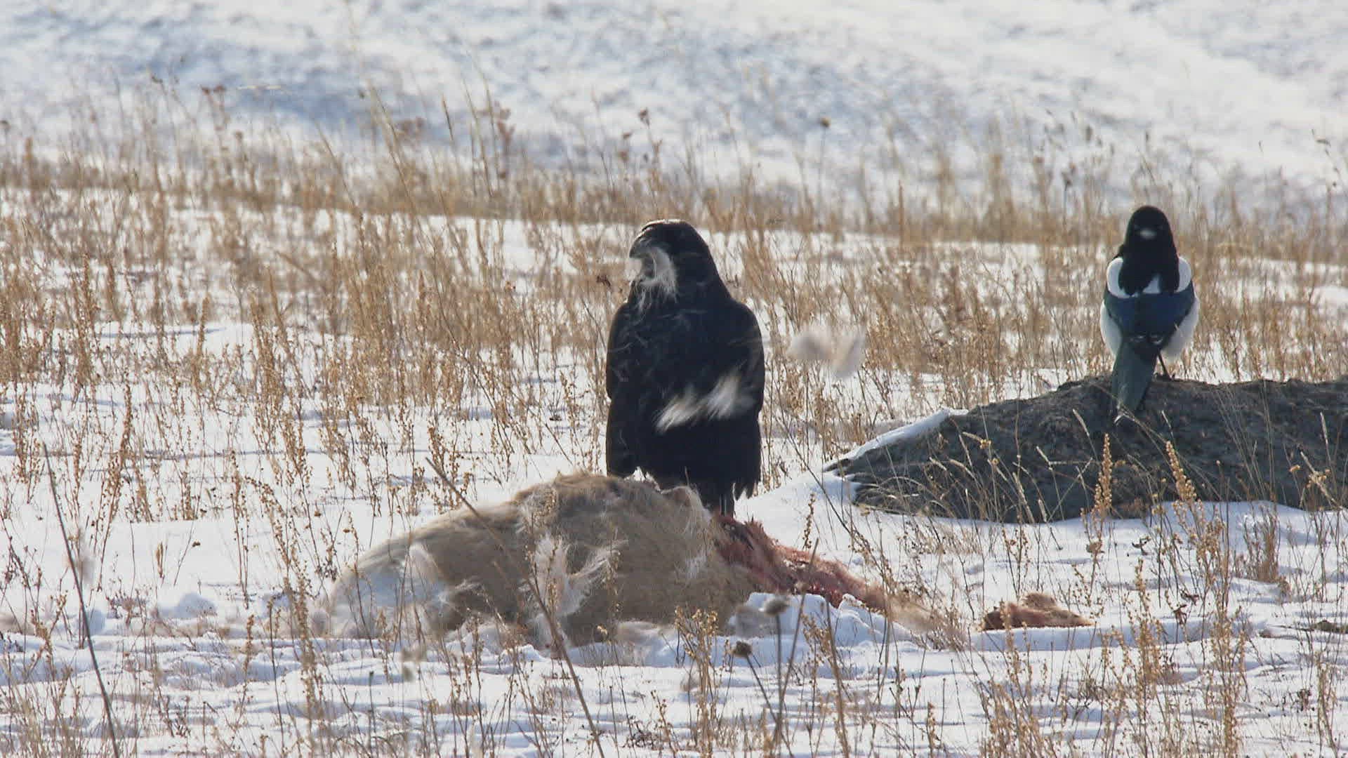 WS Crow (Corvus macrorhynchos) feeding on dead Mongolian gazelle (Procapra gutturosa) with Magpie (Pica pica) standing on rock; Herlen river / Mongolia