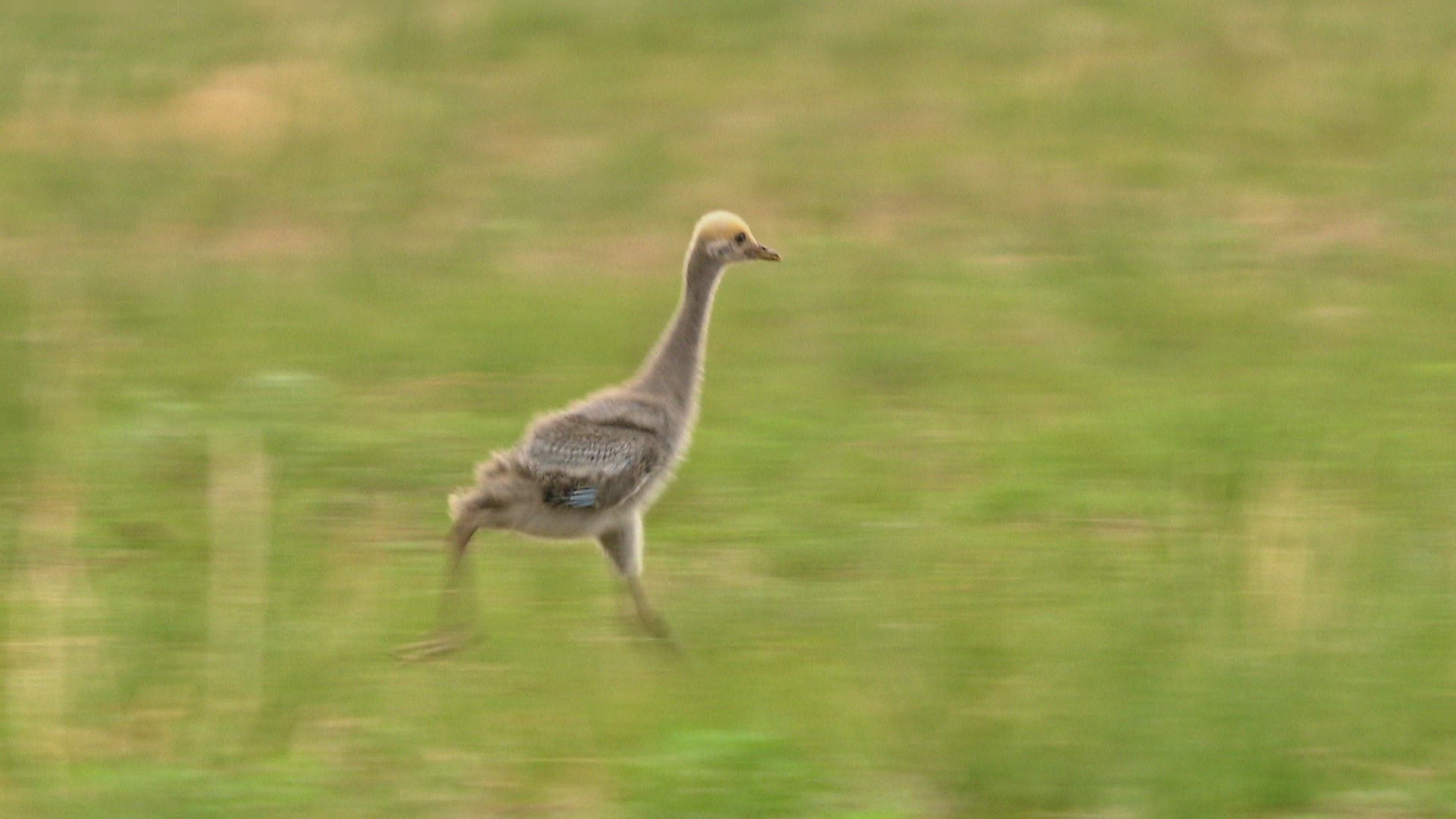 MS PAN SELECTIVE FOCUS Young Demoiselle Crane (Anthropoides Virgo) running in field / Mongolia
