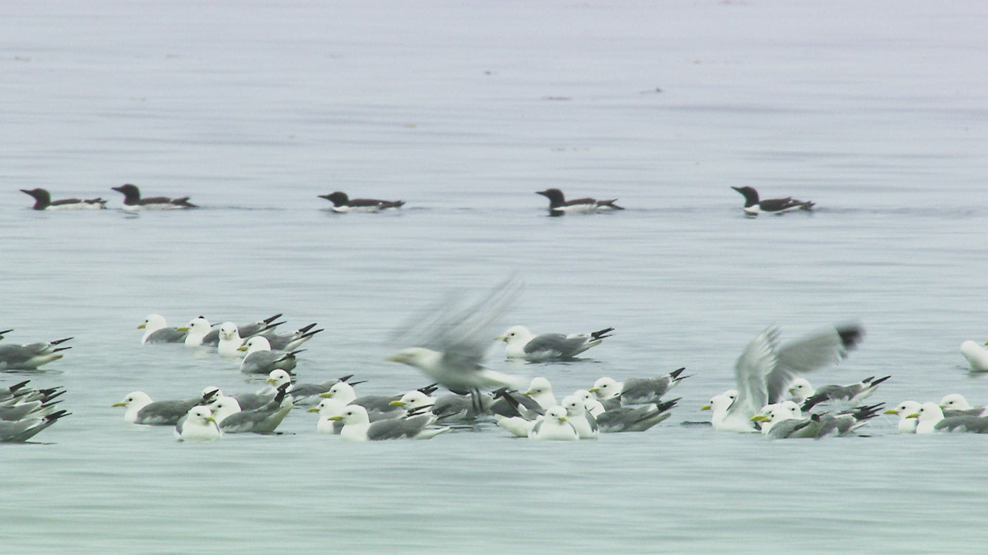 MS Gulls (Larus schistisagus) and other common murres (Uria aalge) swimming in Amur river / Russia