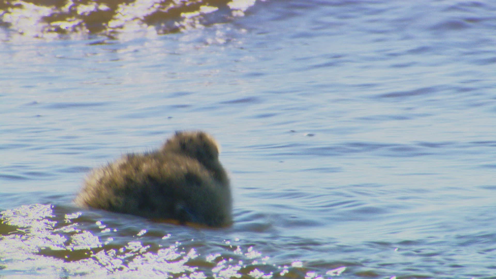MS Young sand martin (Riparia riparia) floating on water in Amur River / Russia