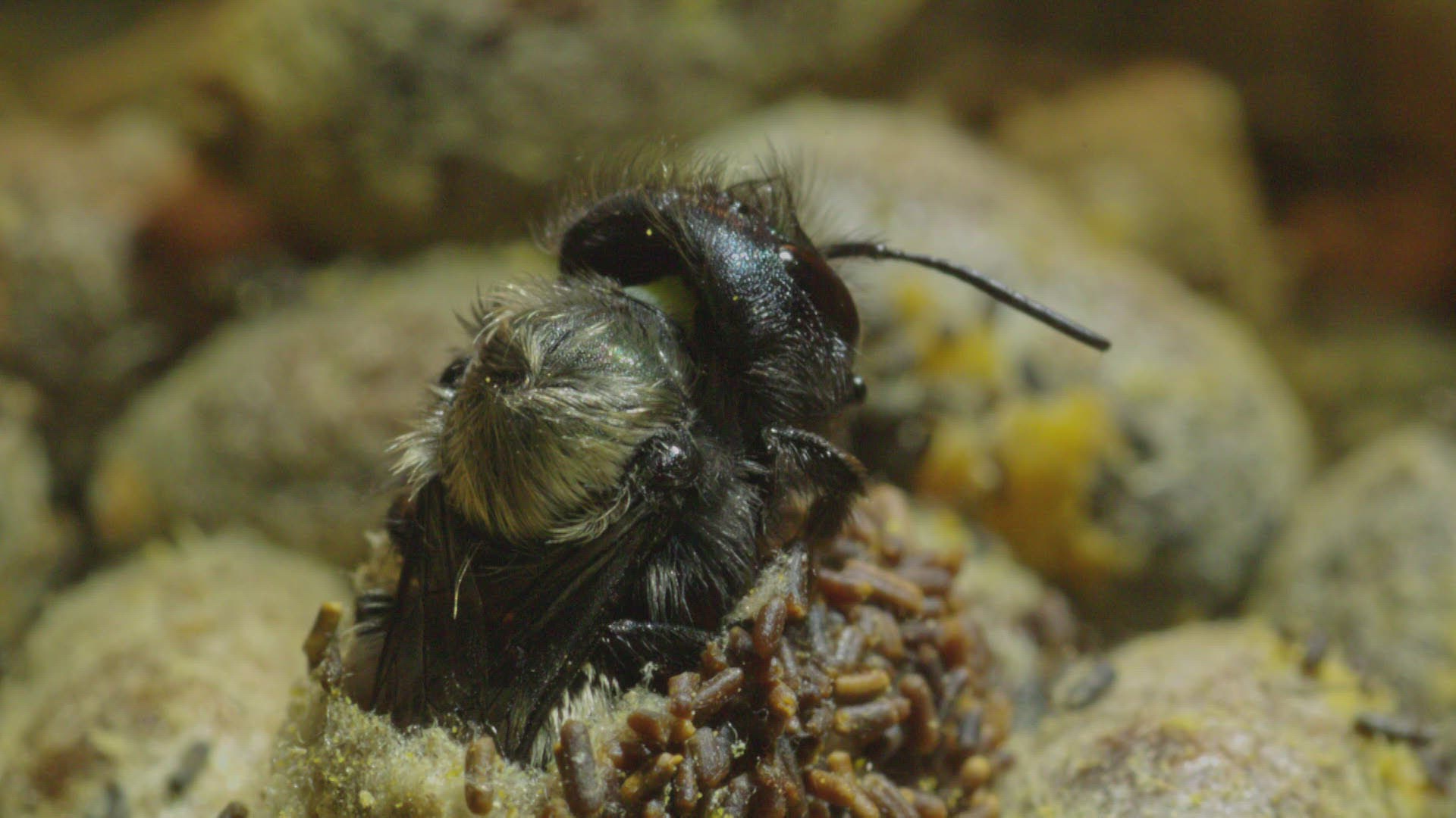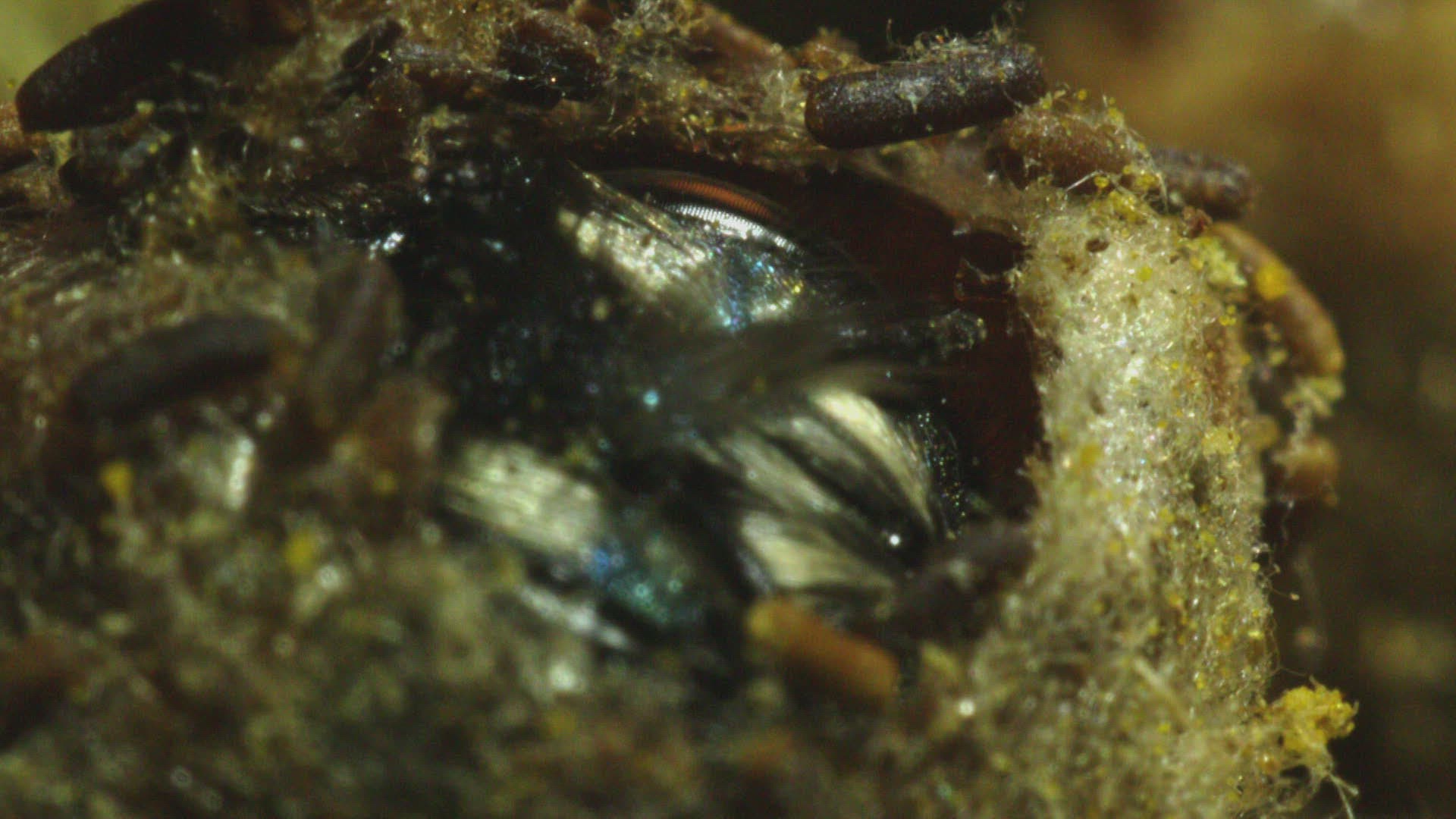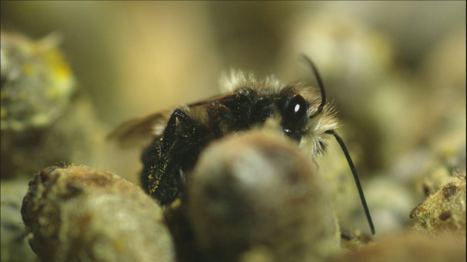 CU SELECTIVE FOCUS SHAKY Wild bee (Apidae) on yellow flower / Russia