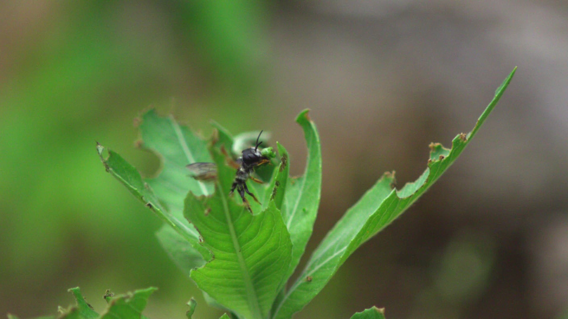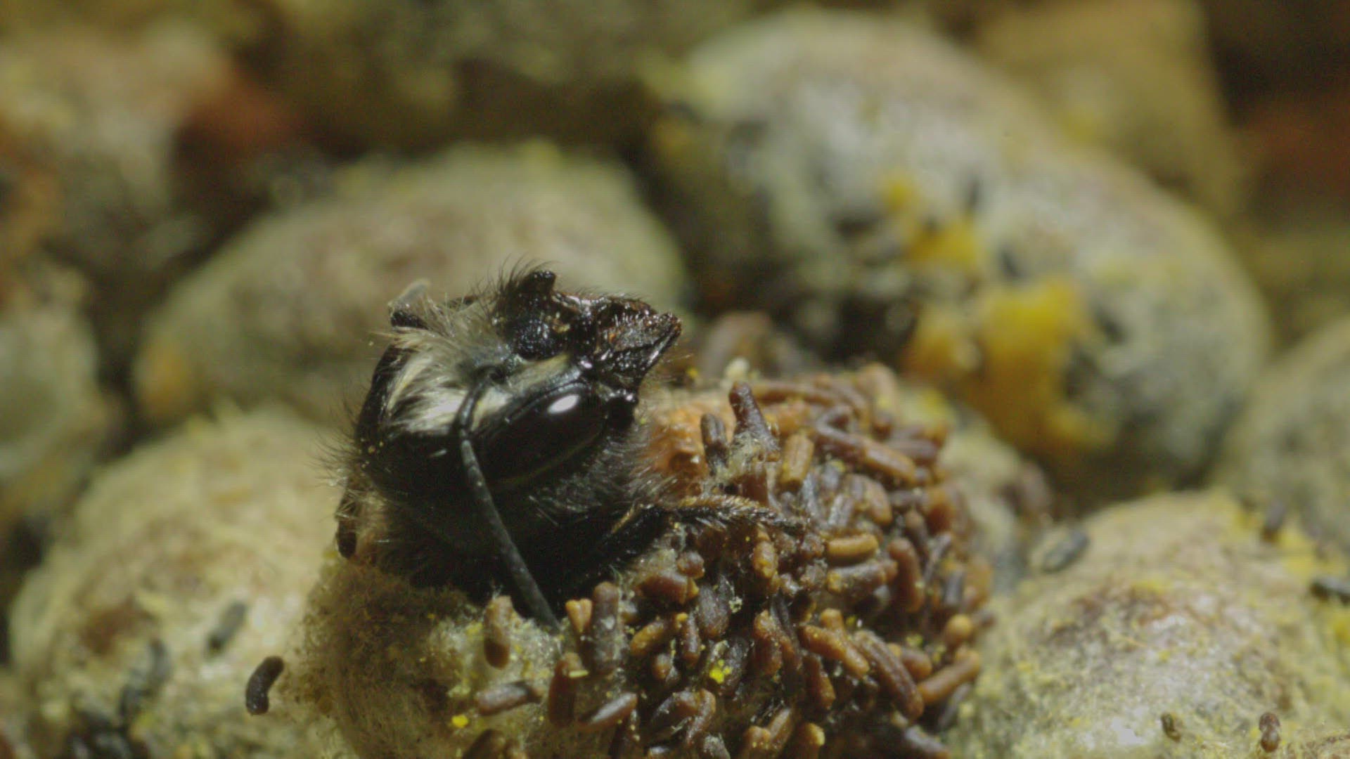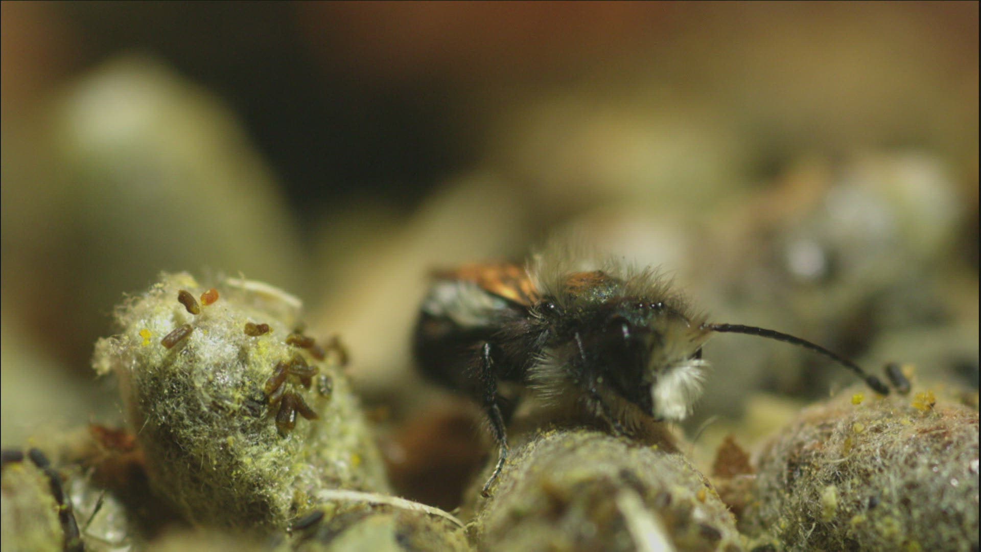 CU SELECTIVE FOCUS SHAKY Wild bee (Apidae) on yellow flower / Russia