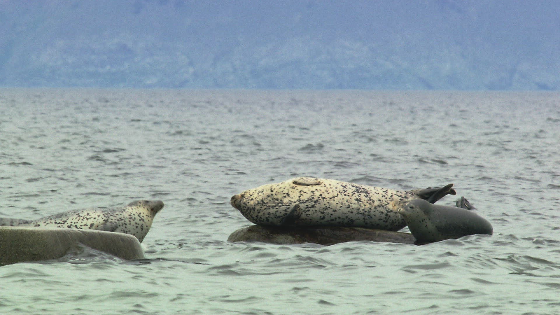 MS Seals (Phoca largha) resting on rocks in Amur river / Russia