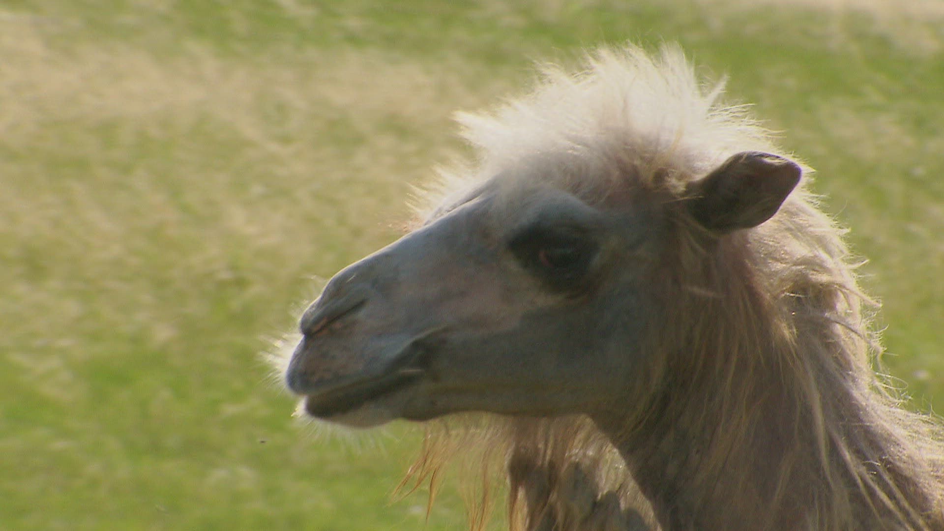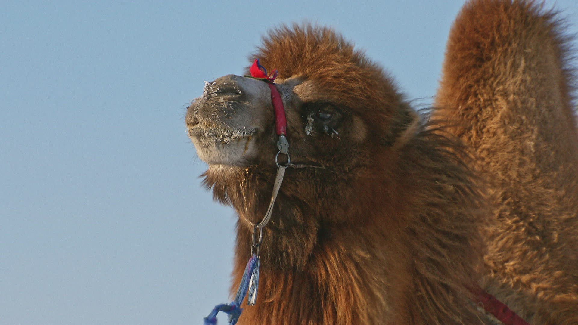 CU ZO Bactrian camels (Camelus ferus) chewing / Mongolia