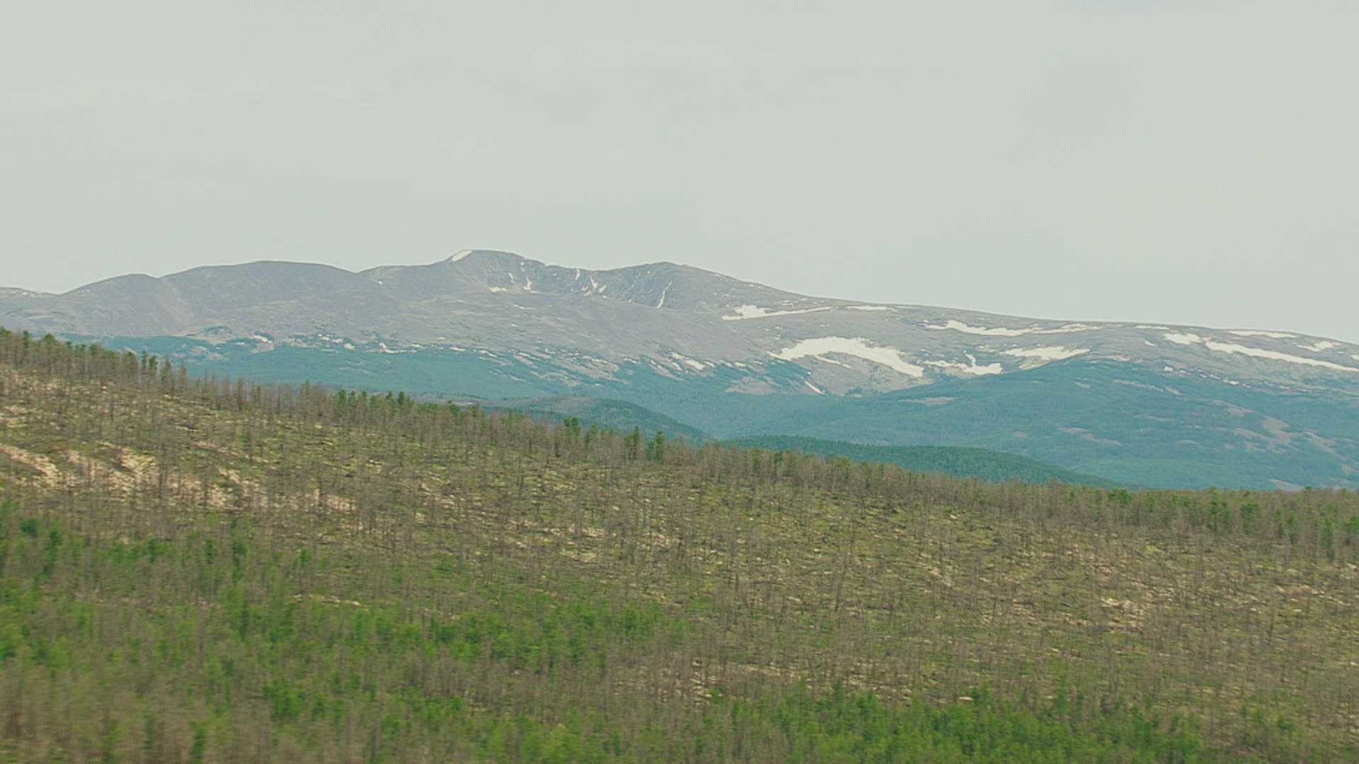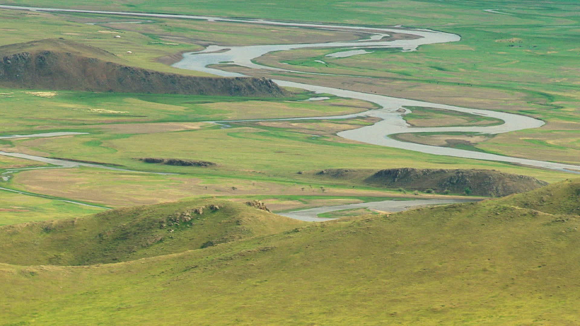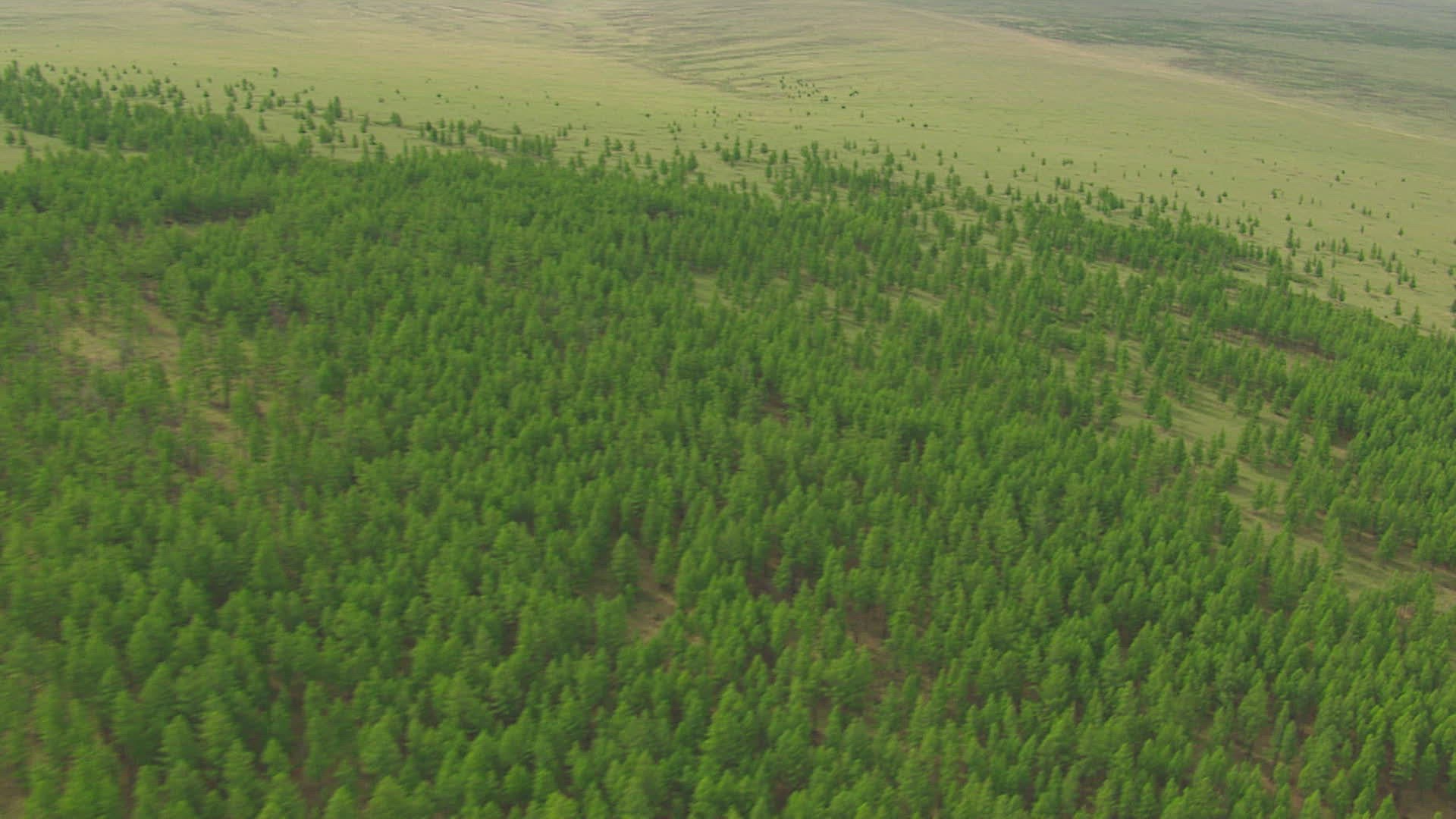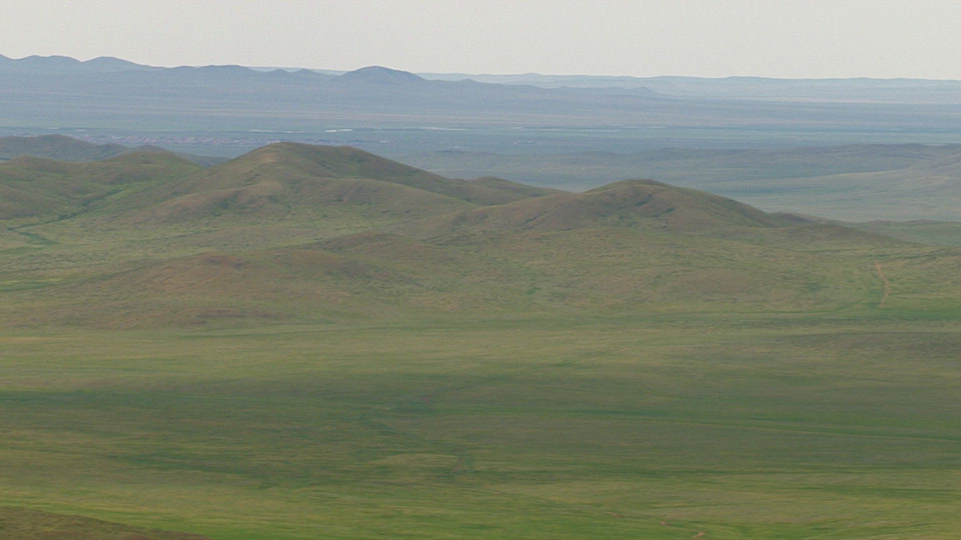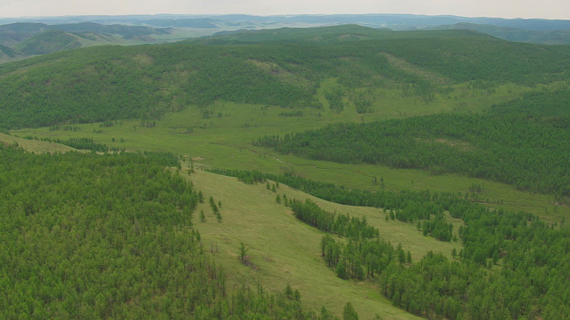 WS AERIAL Rolling landscape on cloudy day / Mongolia