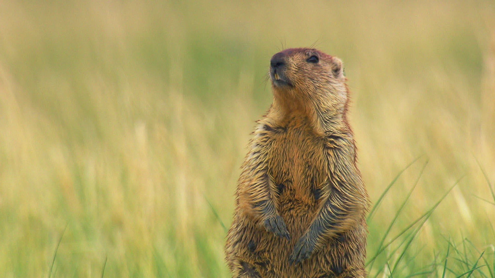 MS TD SELECTIVE FOCUS Adult and young Steppe Marmots (Marmota Bobak) in field / Mongolia