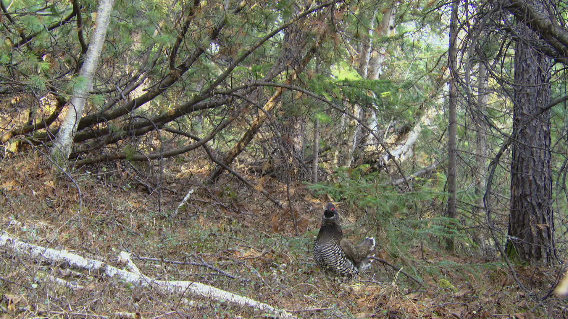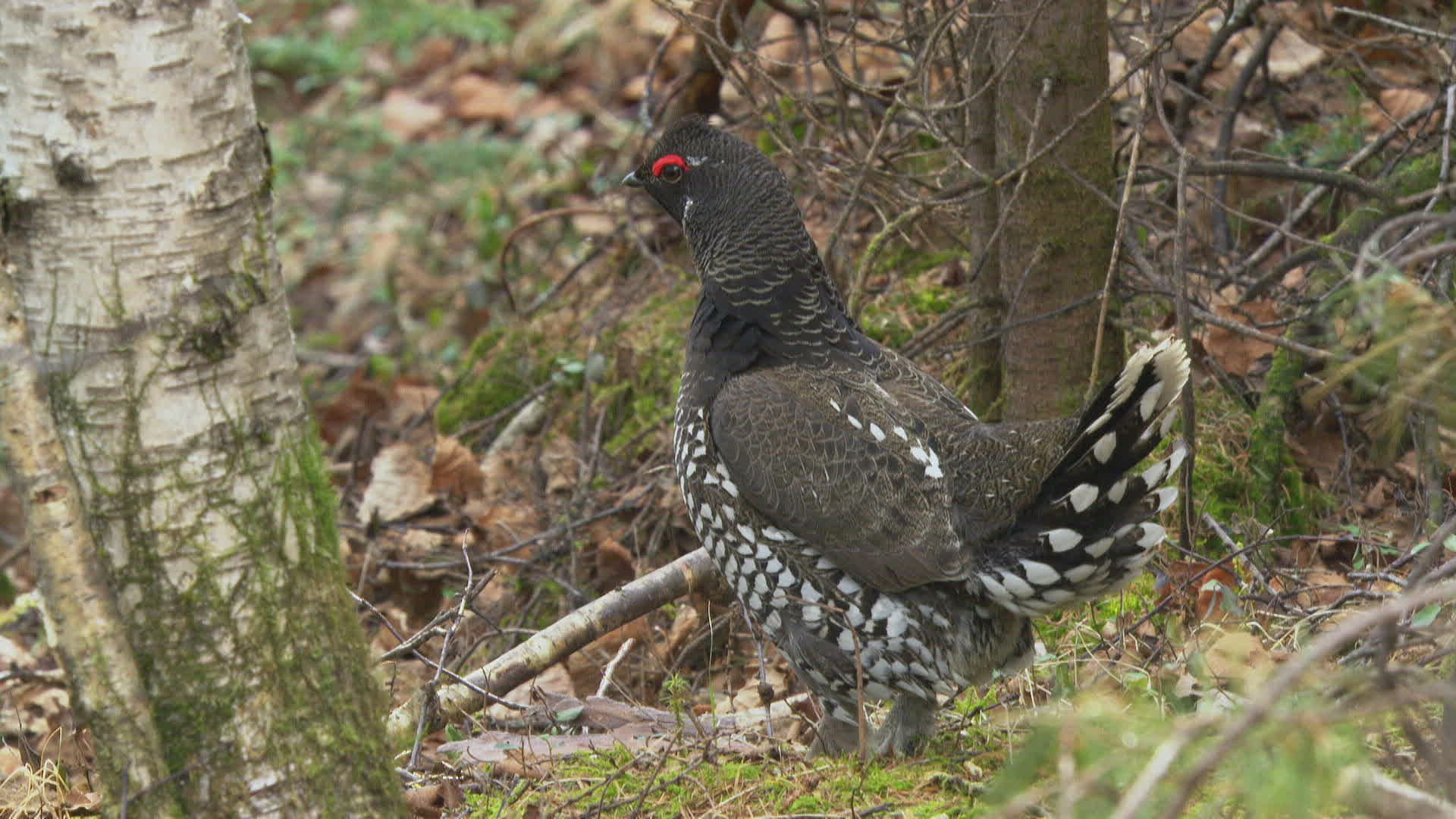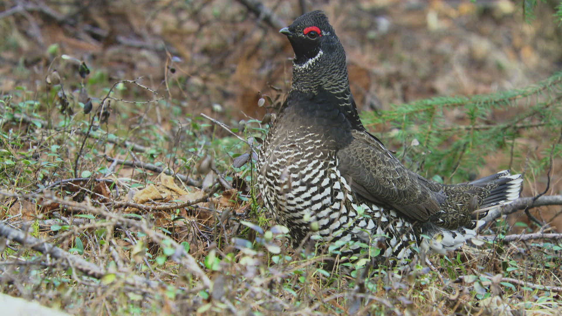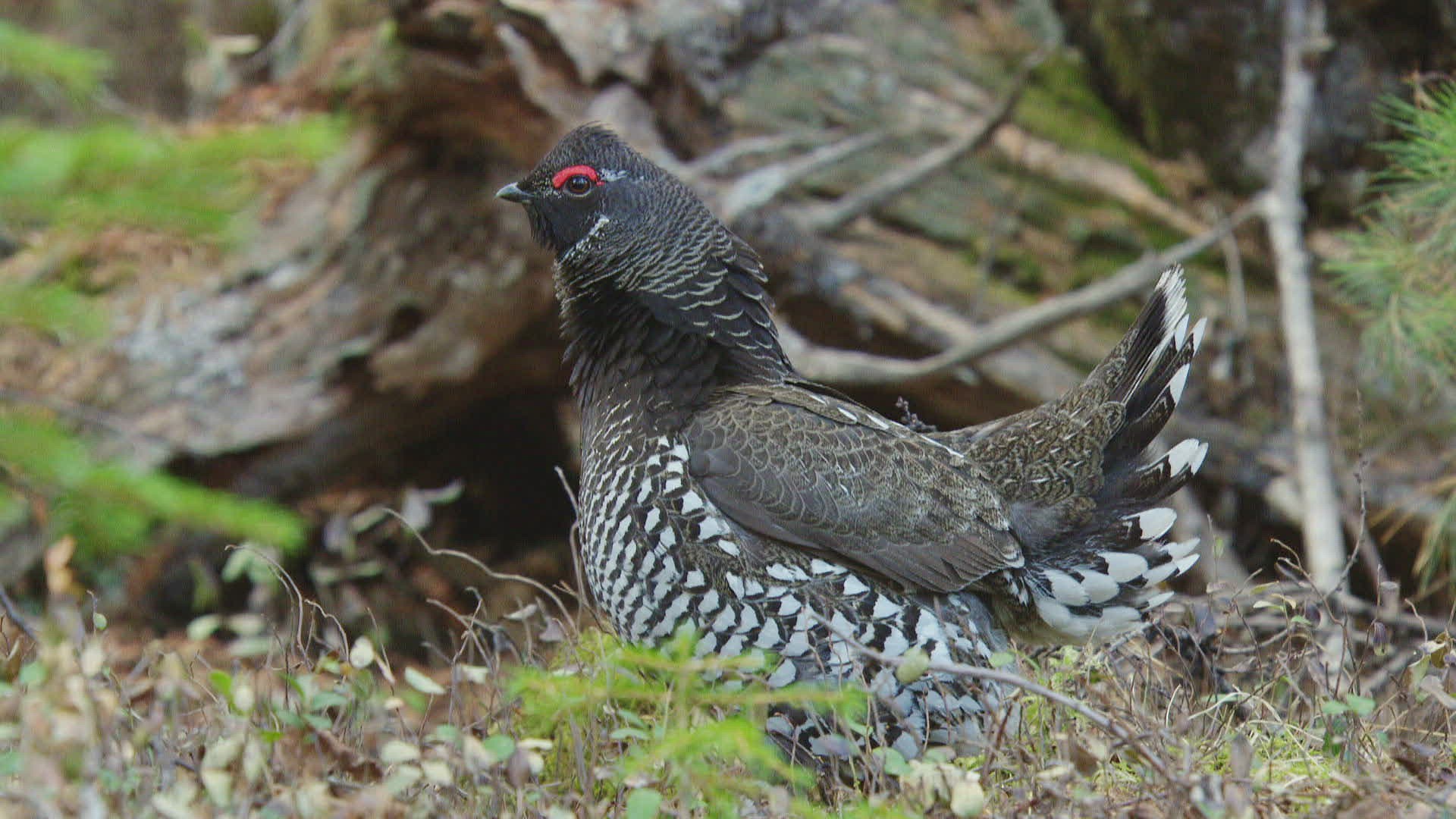 WS SELECTIVE FOCUS Siberian grouse (Falcipennis falcipennis) sitting; Amur river basin / Russia