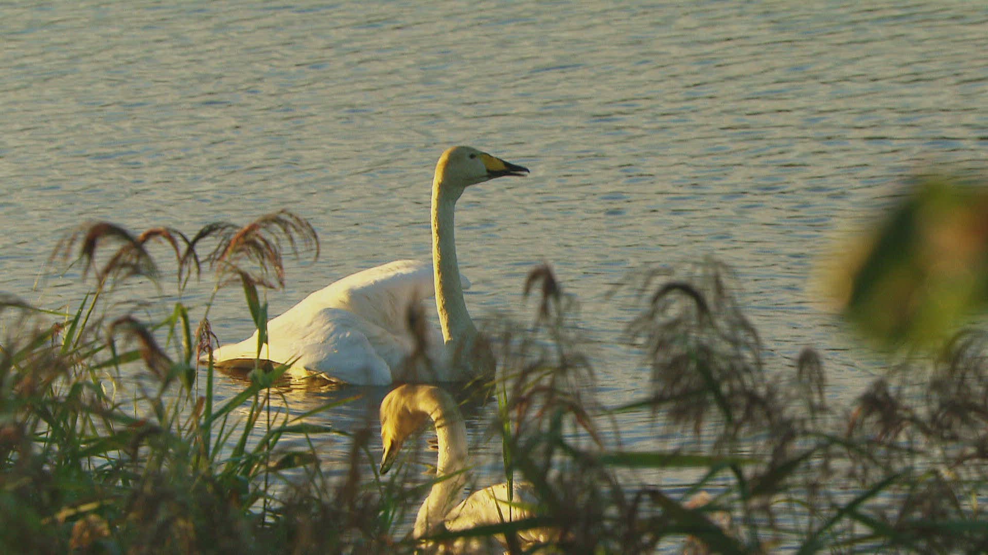CU PAN SELECTIVE FOCUS Whooper Swan (Cygnus cygnus) swimming in river / Russia