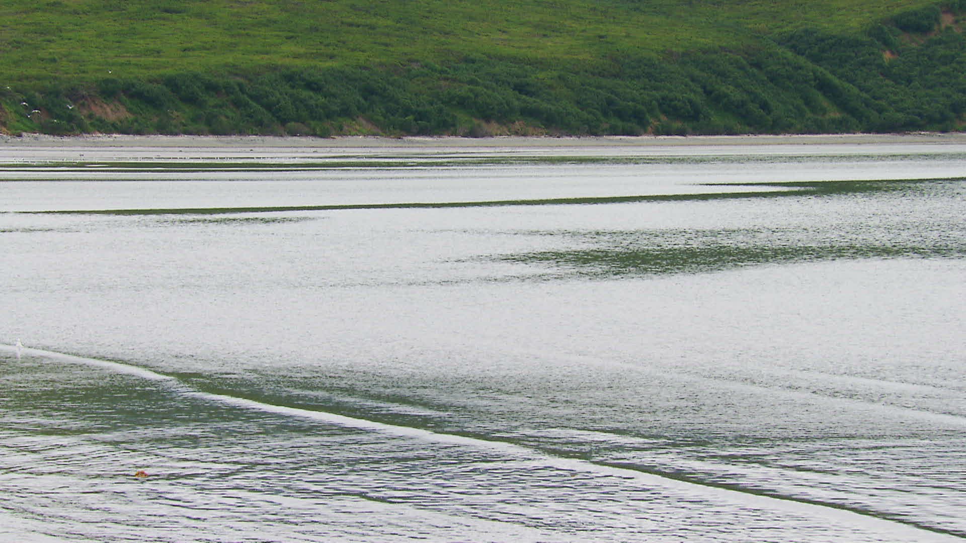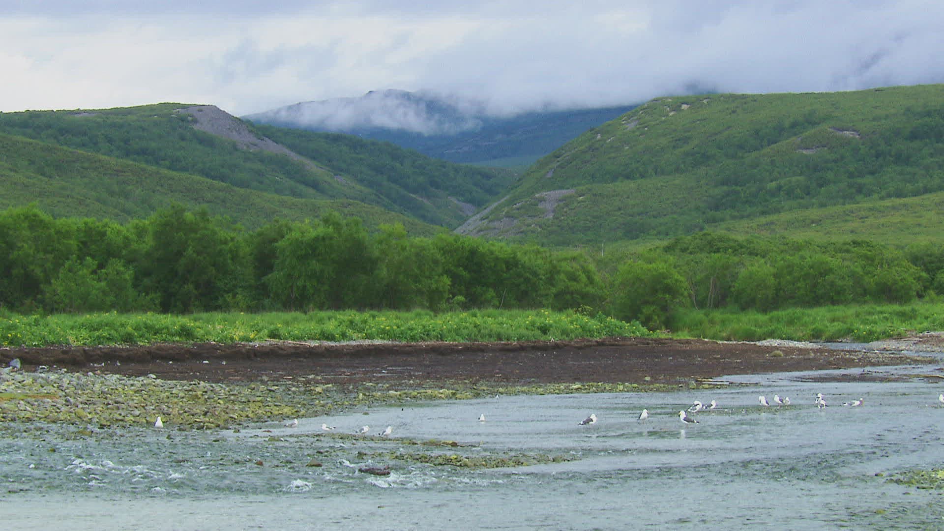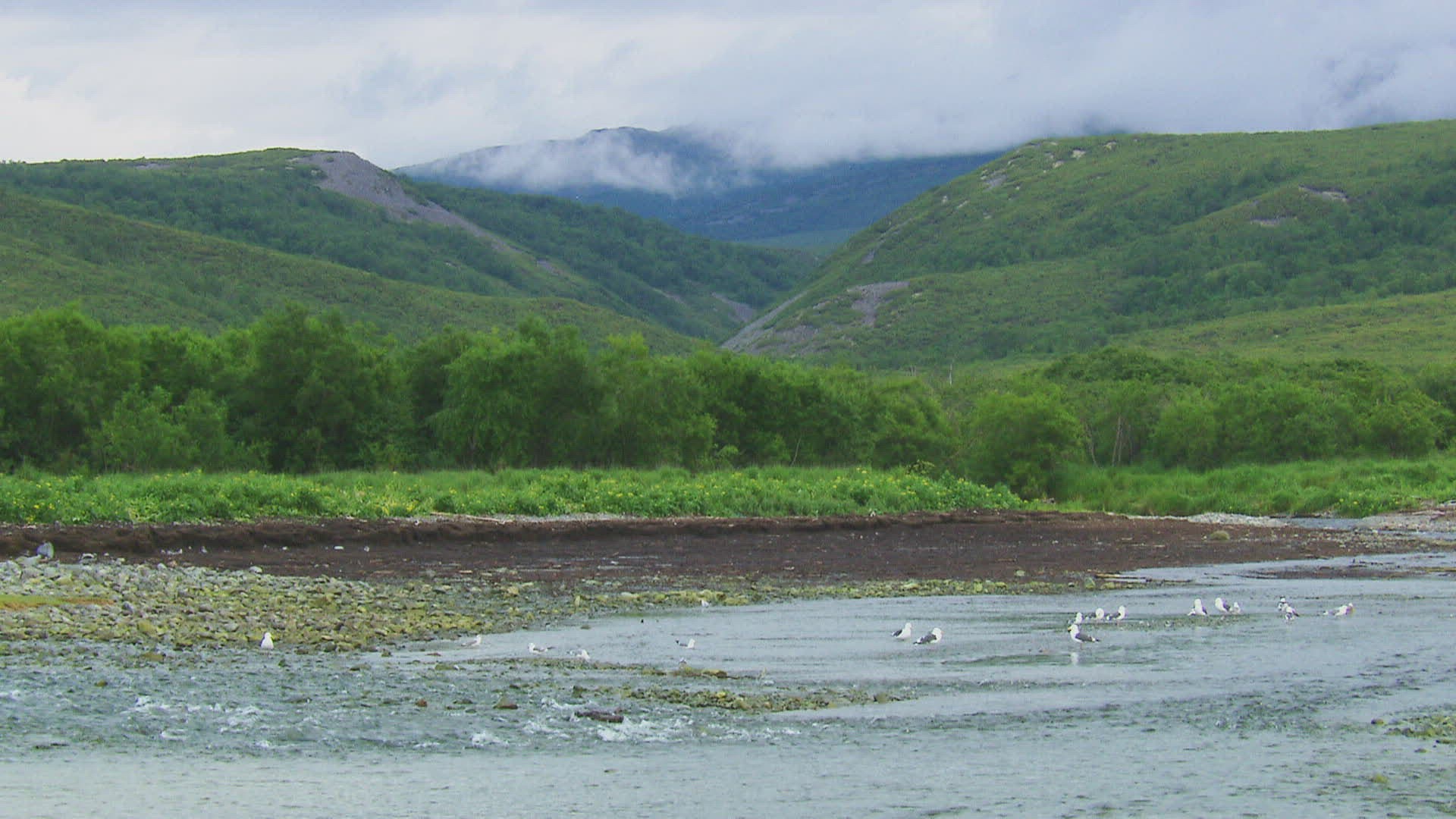 MS ZI CU Brown bear (Ursus arctos) feeding on riverbank; gull (Larus schistisagus) in background; Amur River / Russia