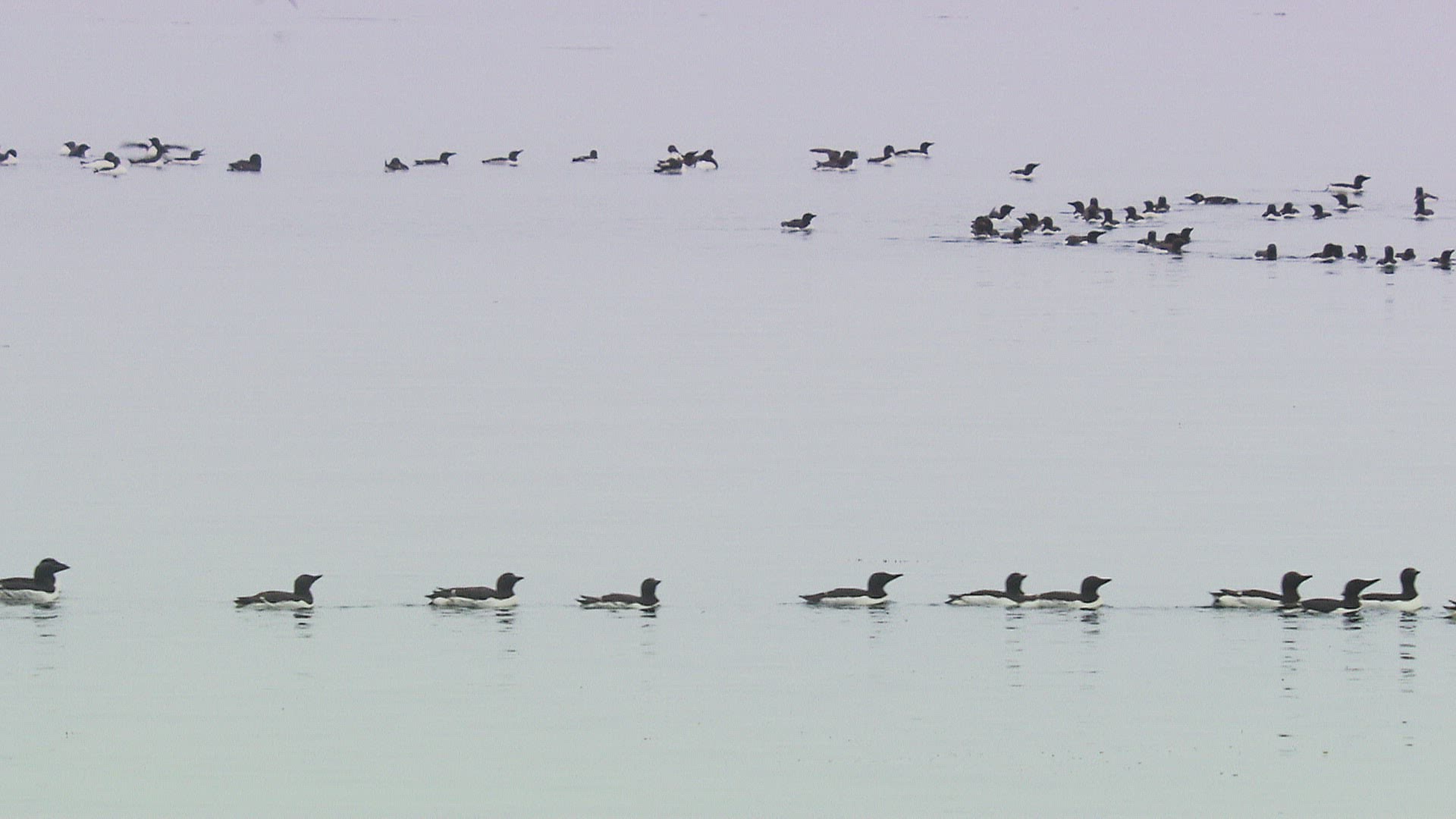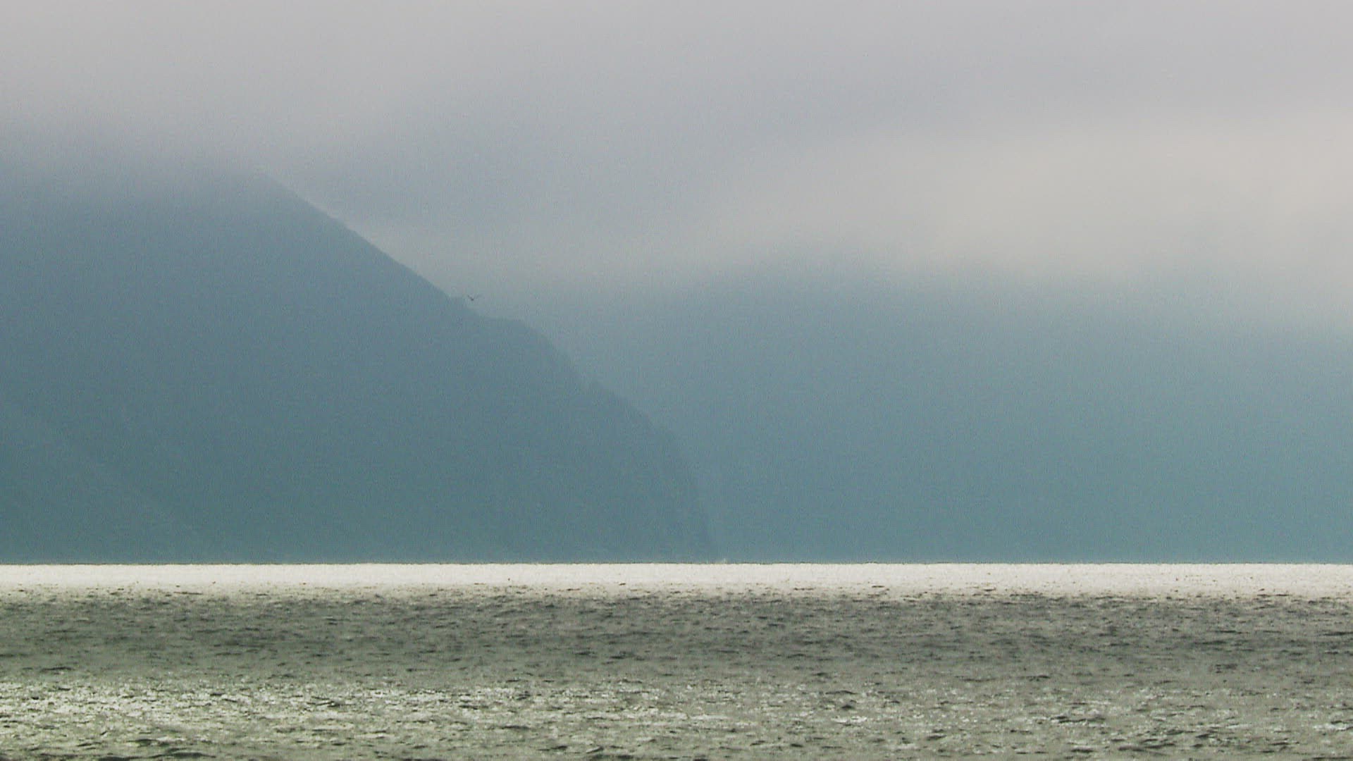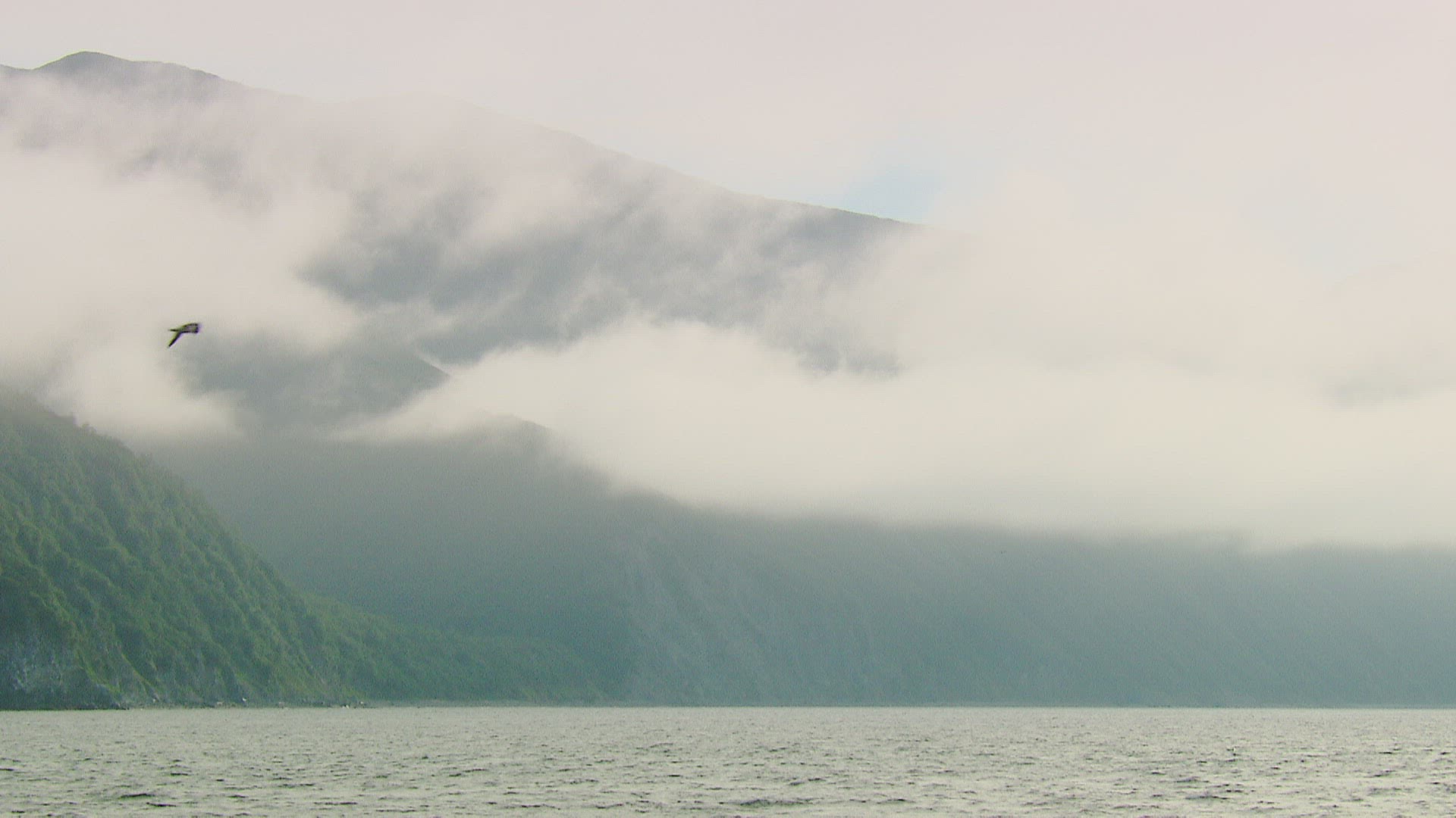 MS ZI CU Brown bear (Ursus arctos) feeding on riverbank; gull (Larus schistisagus) in background; Amur River / Russia
