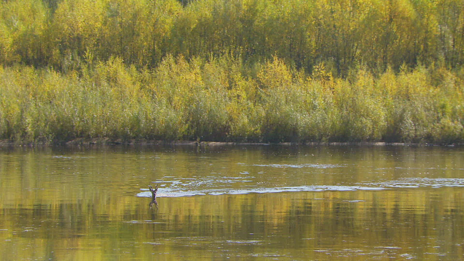WS PAN Siberian roe deer (Capreolus pygargus) swimming in river / Russia