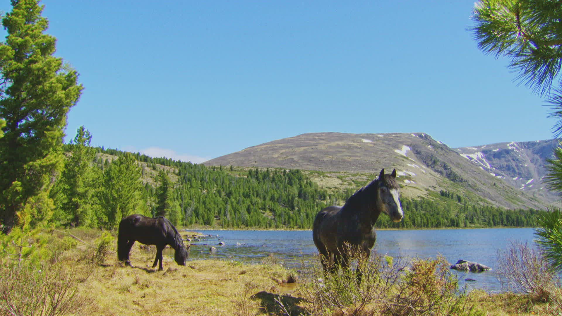 WS Two horses (Equus ferus caballus) grazing by river / Russia
