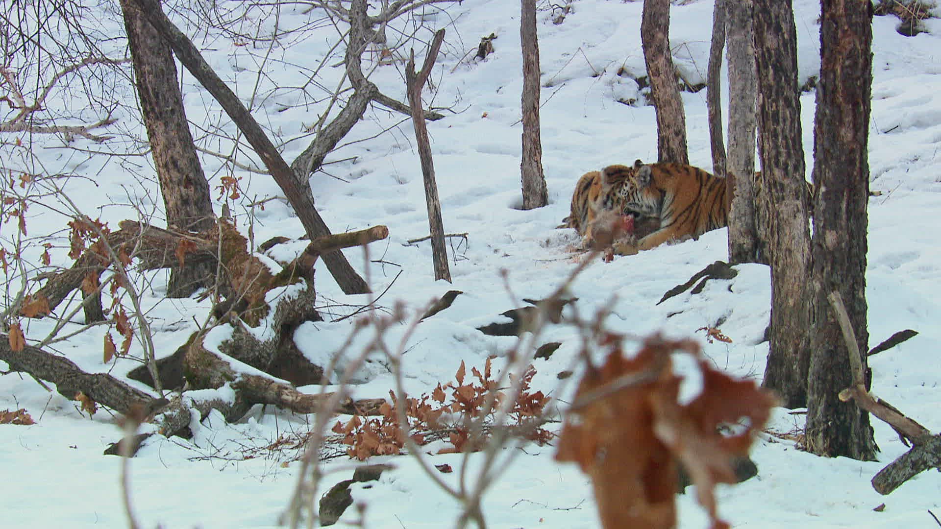 CU PAN SELECTIVE FOCUS TU Tigers (Panthera tigris altaica) eating dead animal; Sikhote Alin / Russia