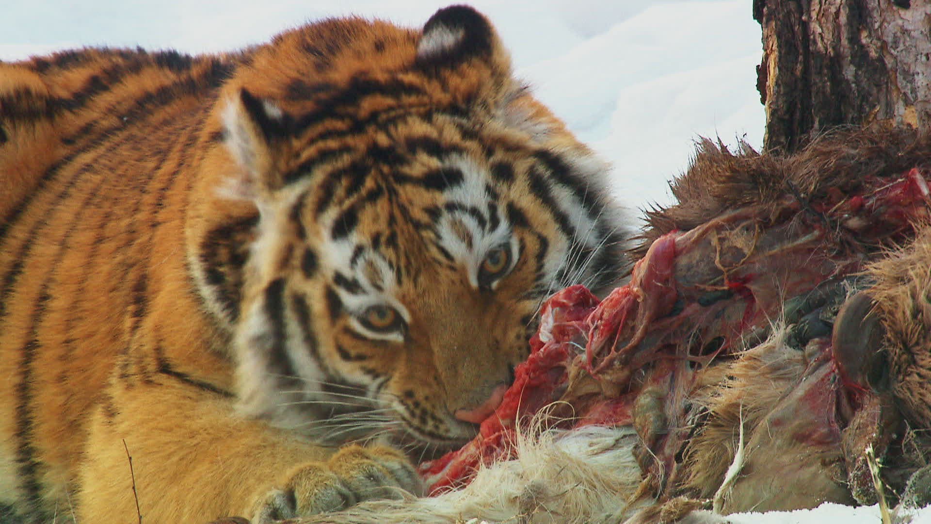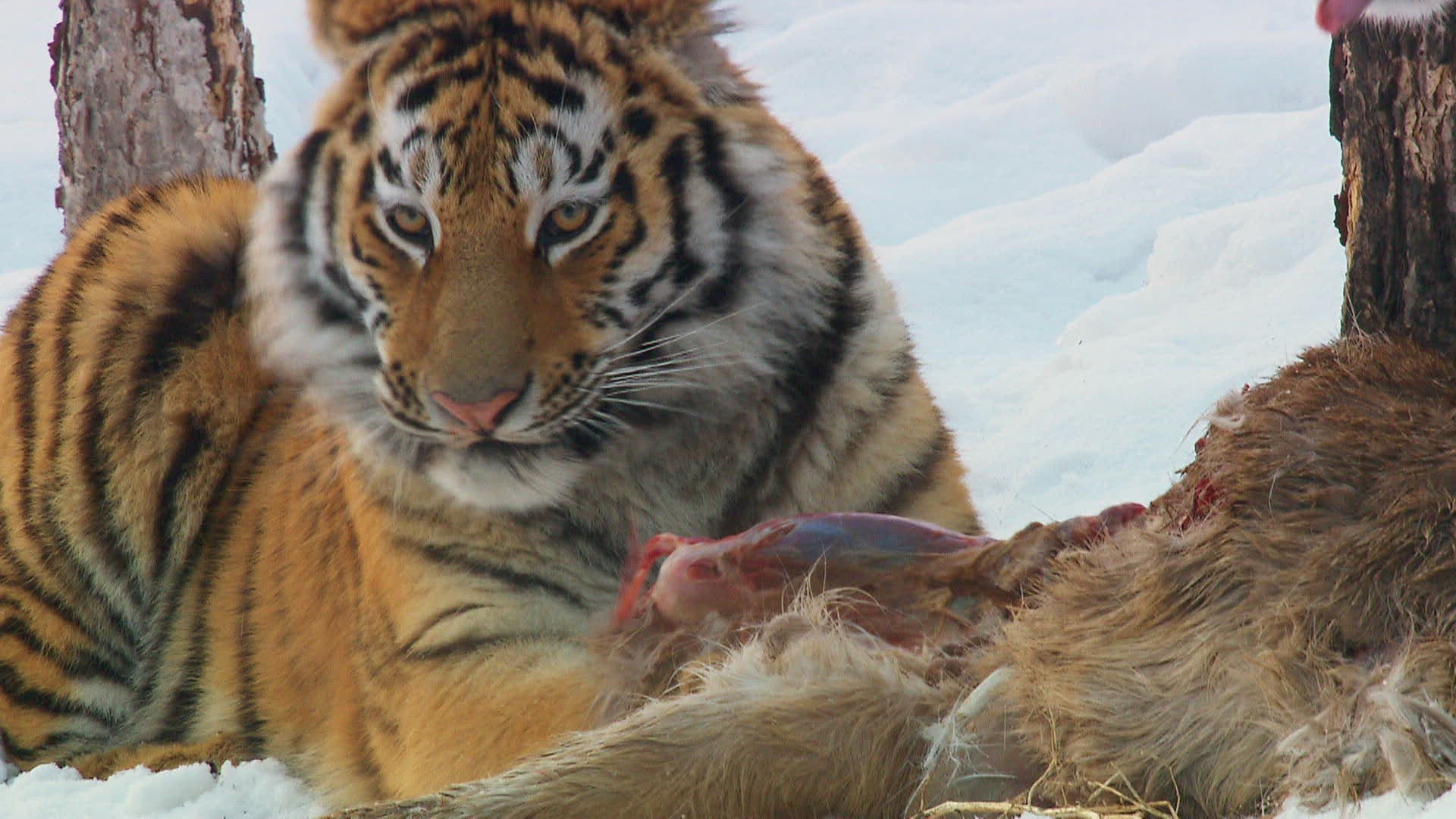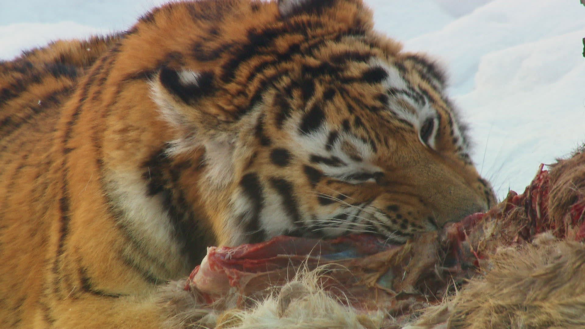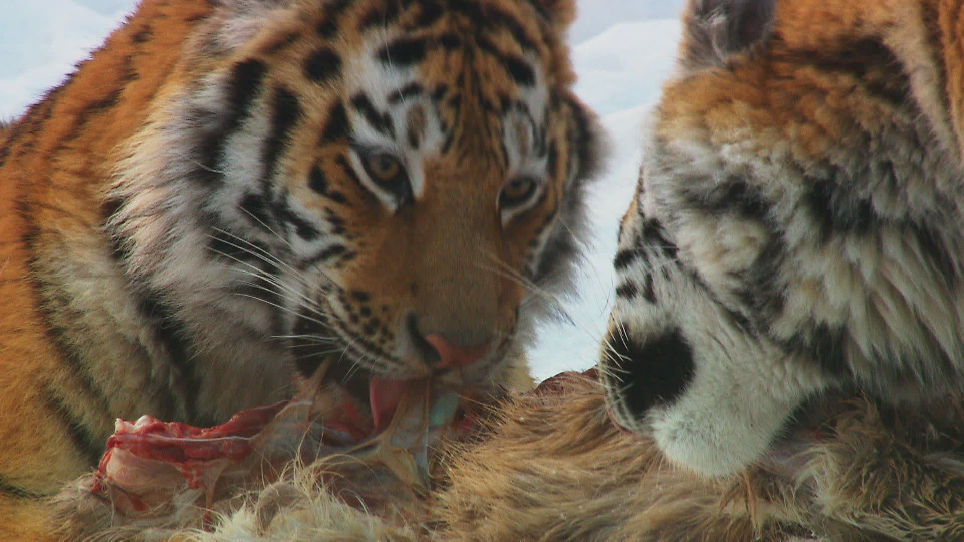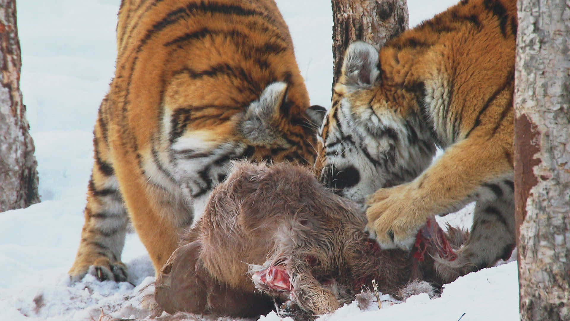 WS Tigers (Panthera tigris altaica) eating dead animal in winter forest; Sikhote Alin / Russia