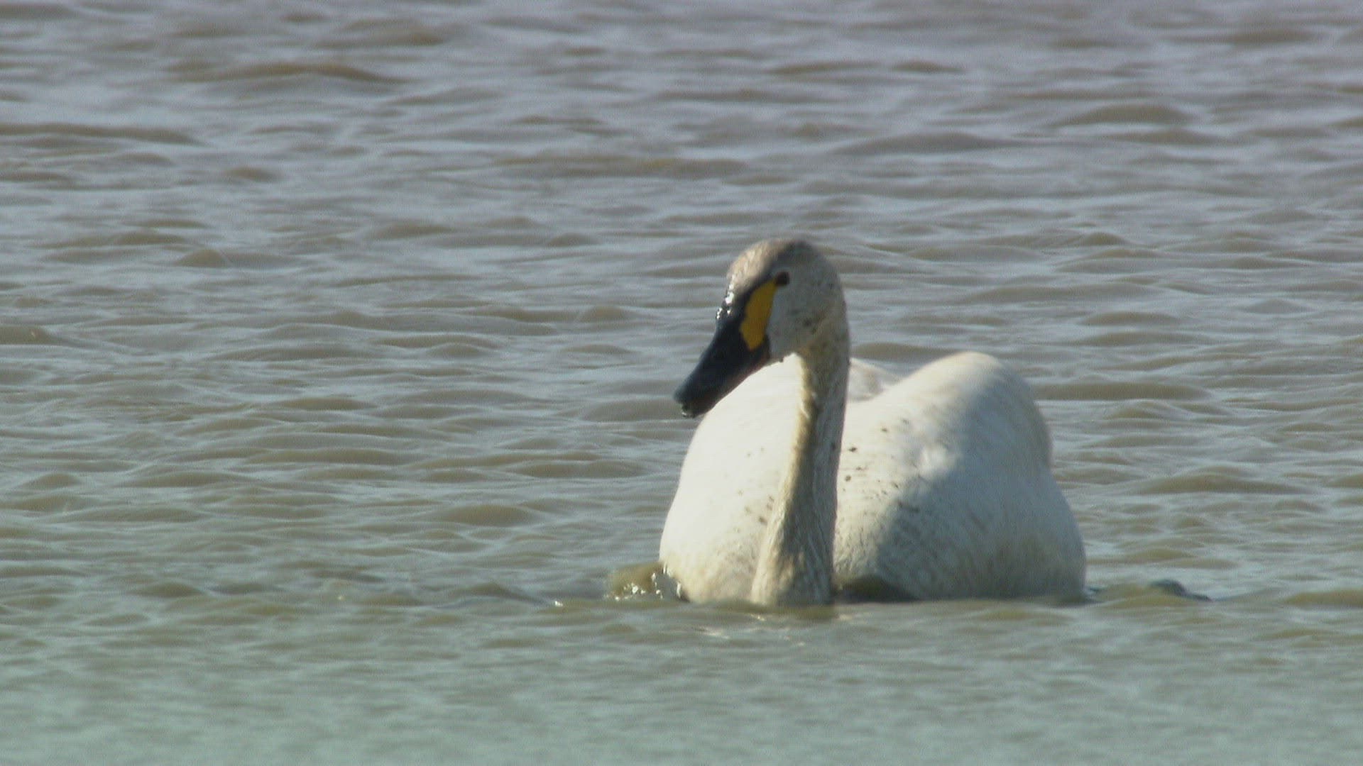 MS SHAKY SELECTIVE FOCUS Tundra swan (Cygnus columbianus) and brown duck (Anatidae) foraging for food in water Herlen river / Mongolia