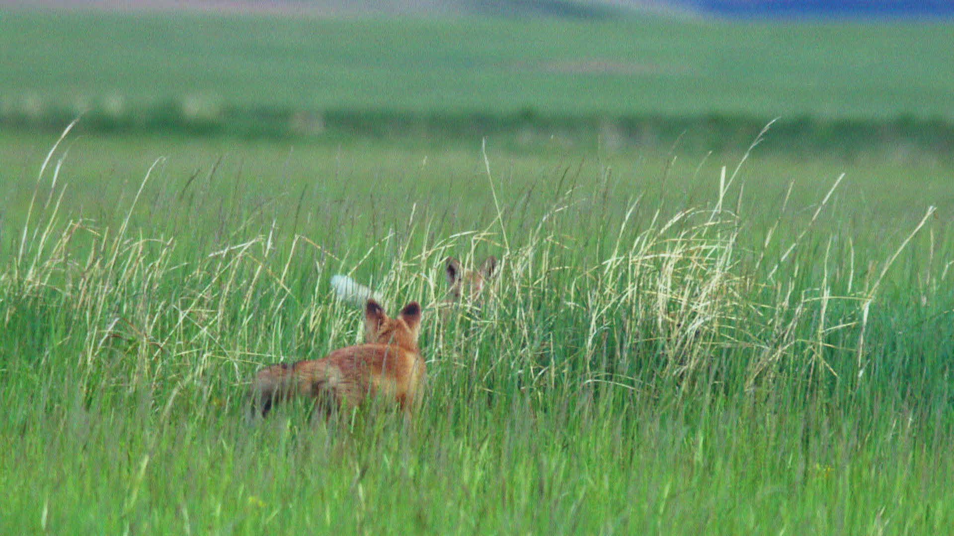 MS PAN SELECTIVE FOCUS Playful young foxes (Vulpes) in green meadow / Mongolia