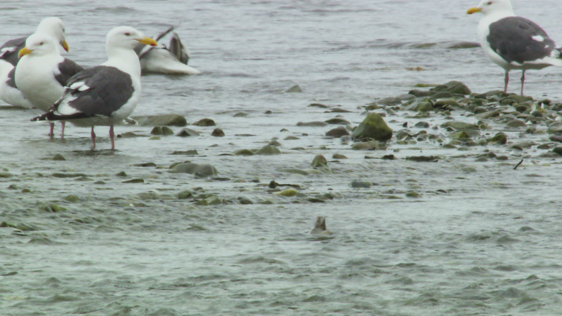 MS PAN Fish swimming in Amur river basin with Seagulls (Larus schistisagus) nearby / Russia
